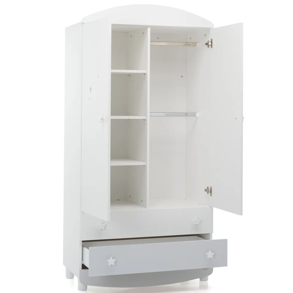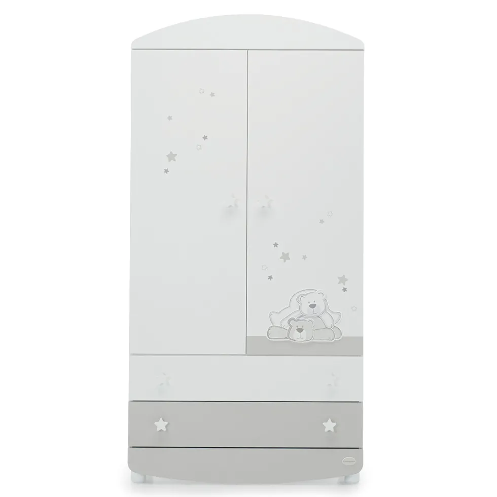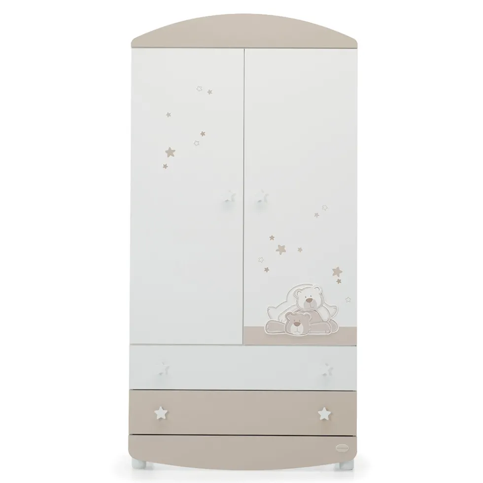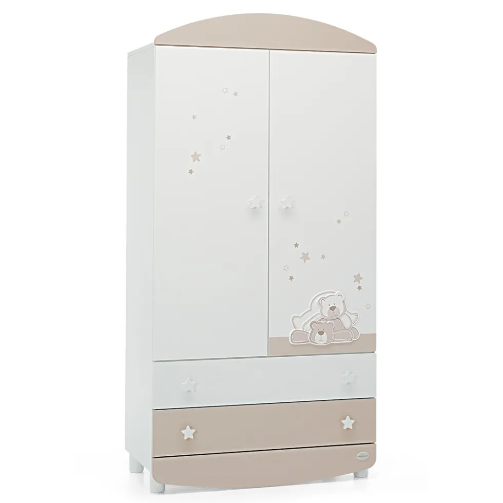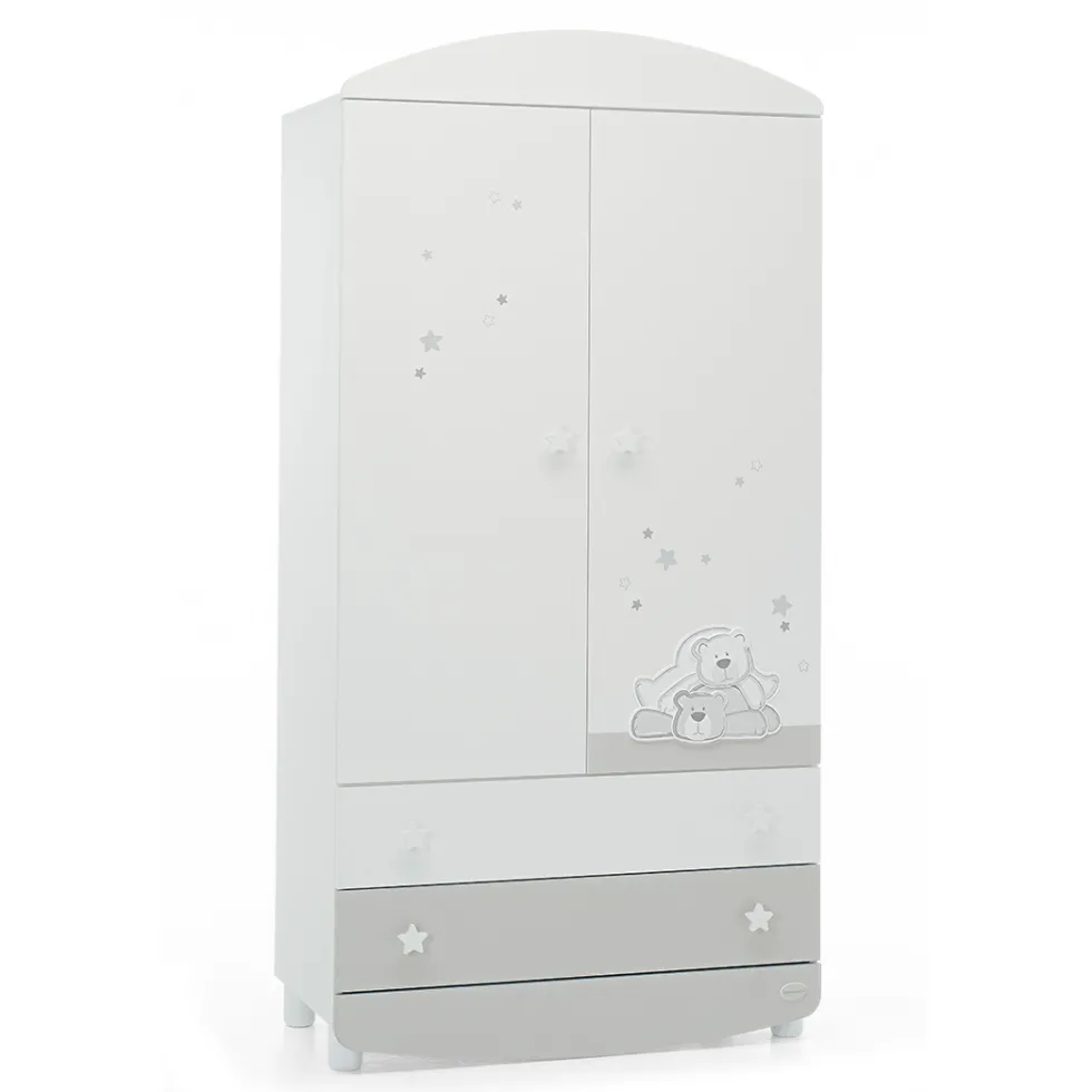 Le maniglie sono a forma di stella e le due ante hanno applicazioni con i personaggi che caratterizzano la collezione: divertenti orsetti giocherelloni e tante stelline raffinate.