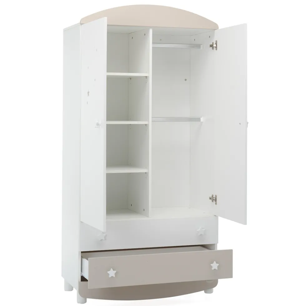 Il capiente armadio in legno a due ante Dolcestella di Foppapedretti ha due spaziosi cassetti, ampi vani con piani regolabili e due barre appendiabiti.