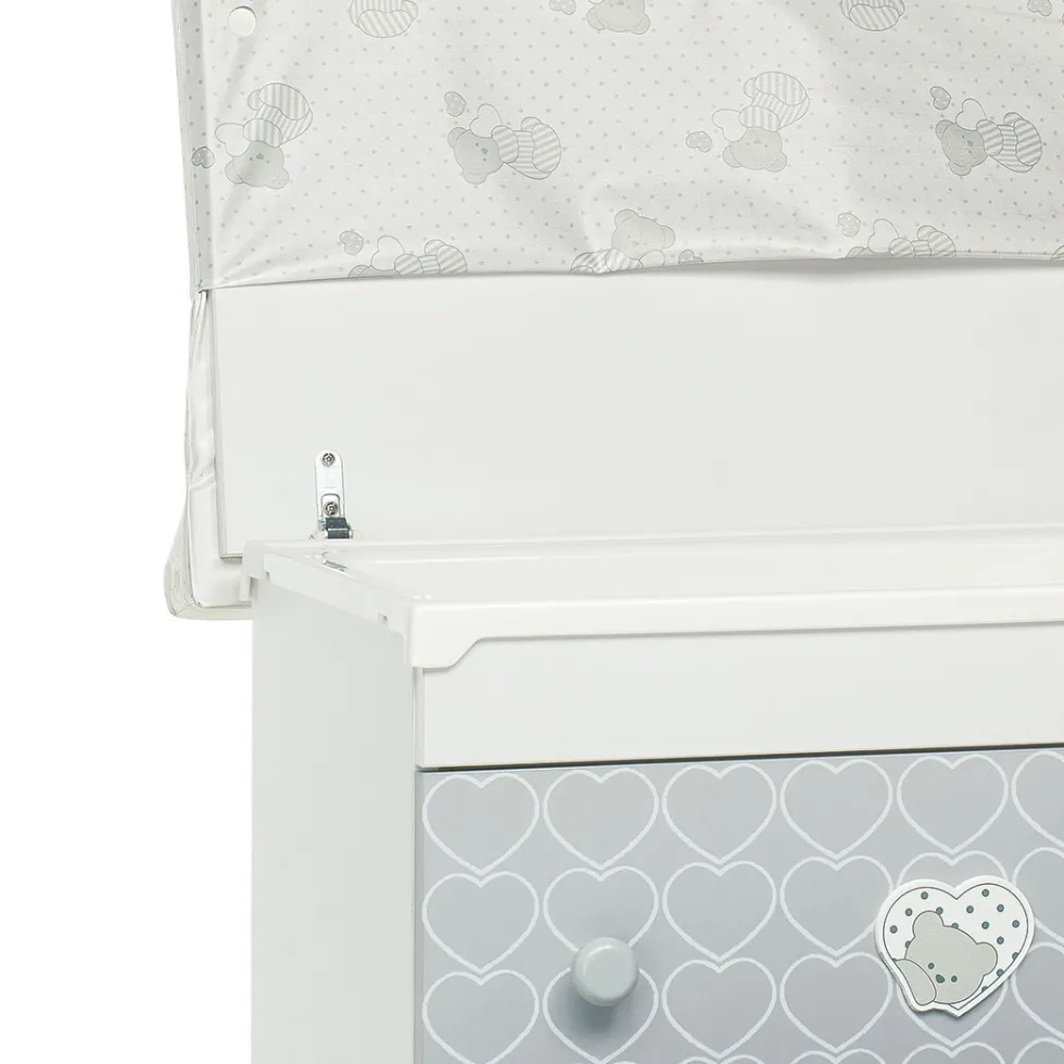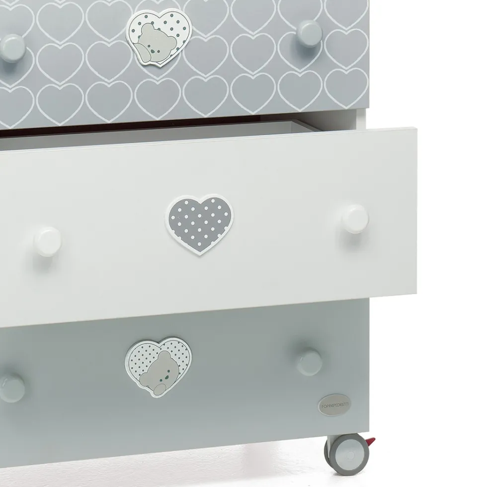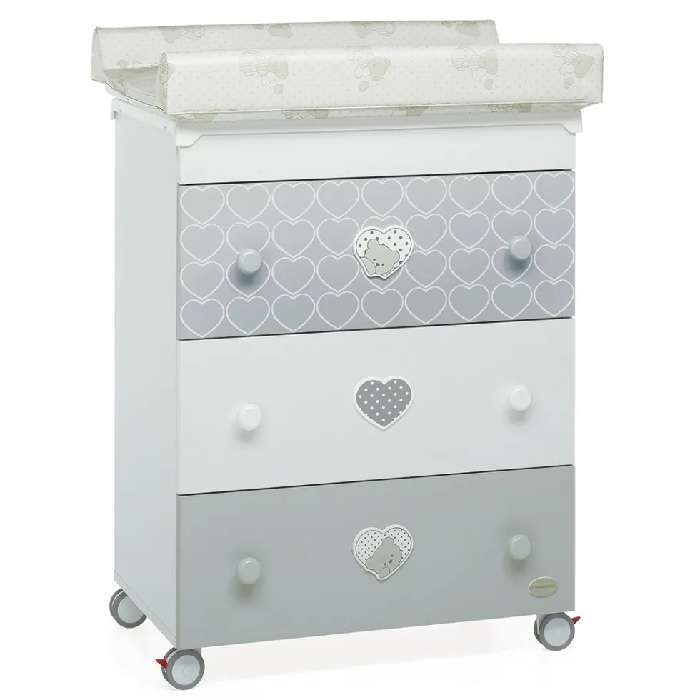Caratterizzato da tonalità all’insegna del bianco e grigio, sui tre ampi cassetti ha decorazioni con teneri cuori che racchiudono un dolcissimo orsetto. Ha ruote gommate antigraffio, con sistema frenante, per facilitare gli spostamenti.