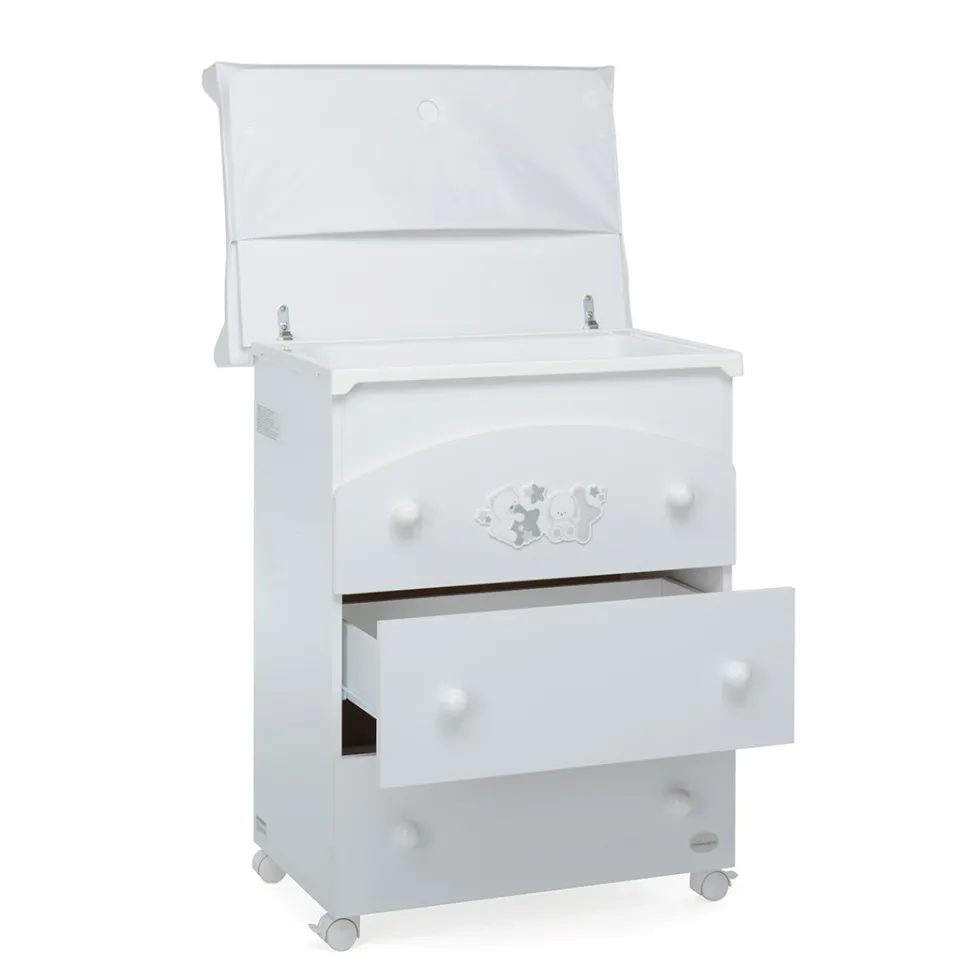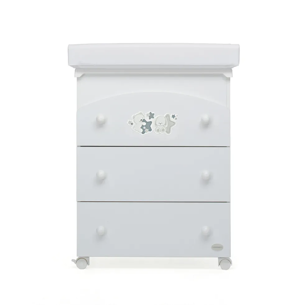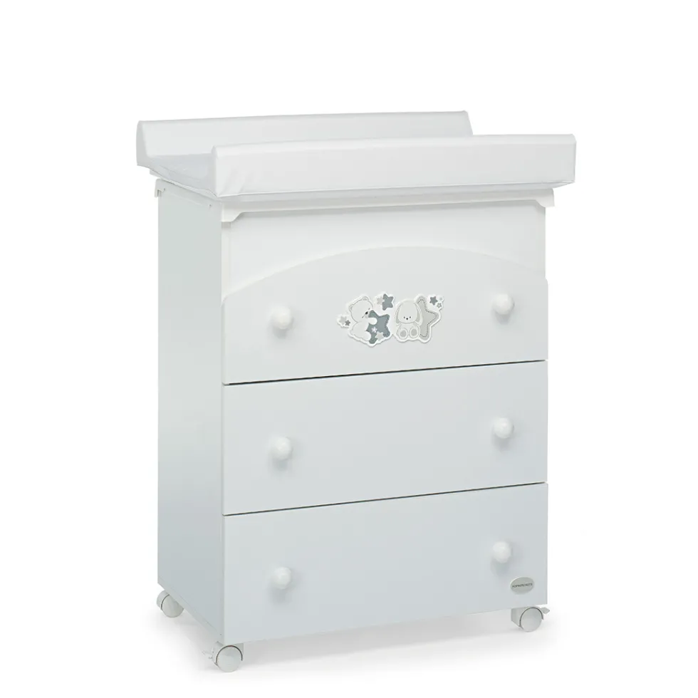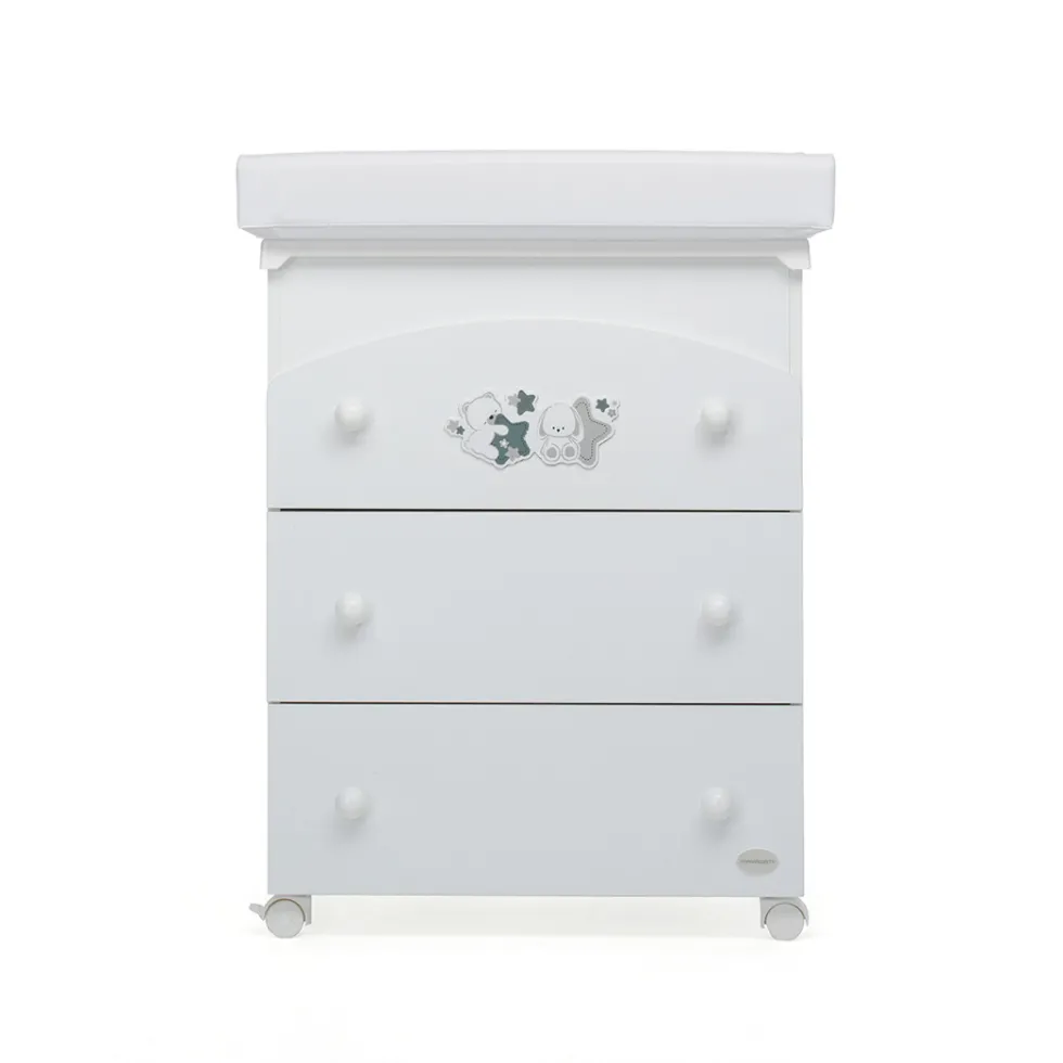 Il cassetto superiore è caratterizzato da un decoro in rilievo, nelle tonalità del bianco e del grigio, con due piccoli amici: un dolcissimo coniglietto e un simpatico orsetto che giocano con alcune stelline. Ha tre ampi cassetti e ruote con sistema frenante, per facilitare gli spostamenti.