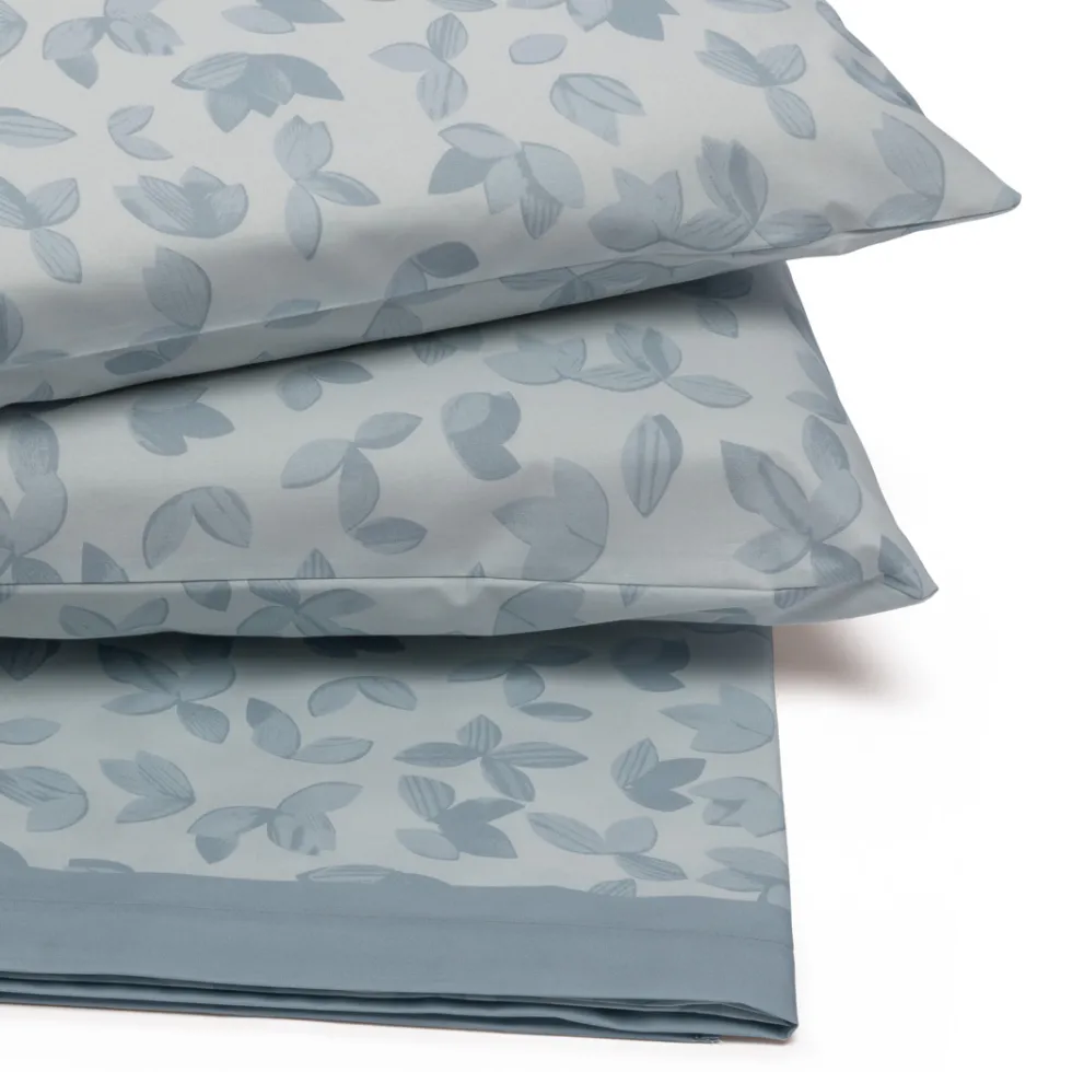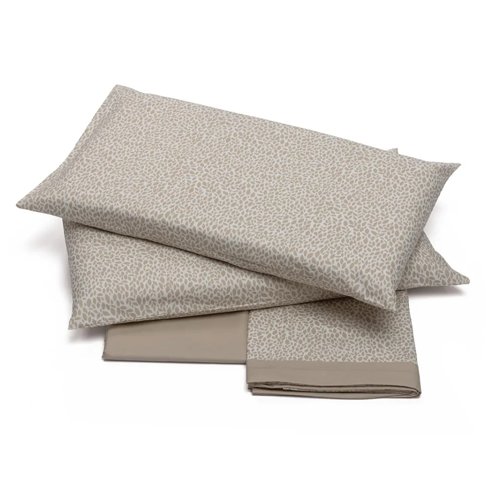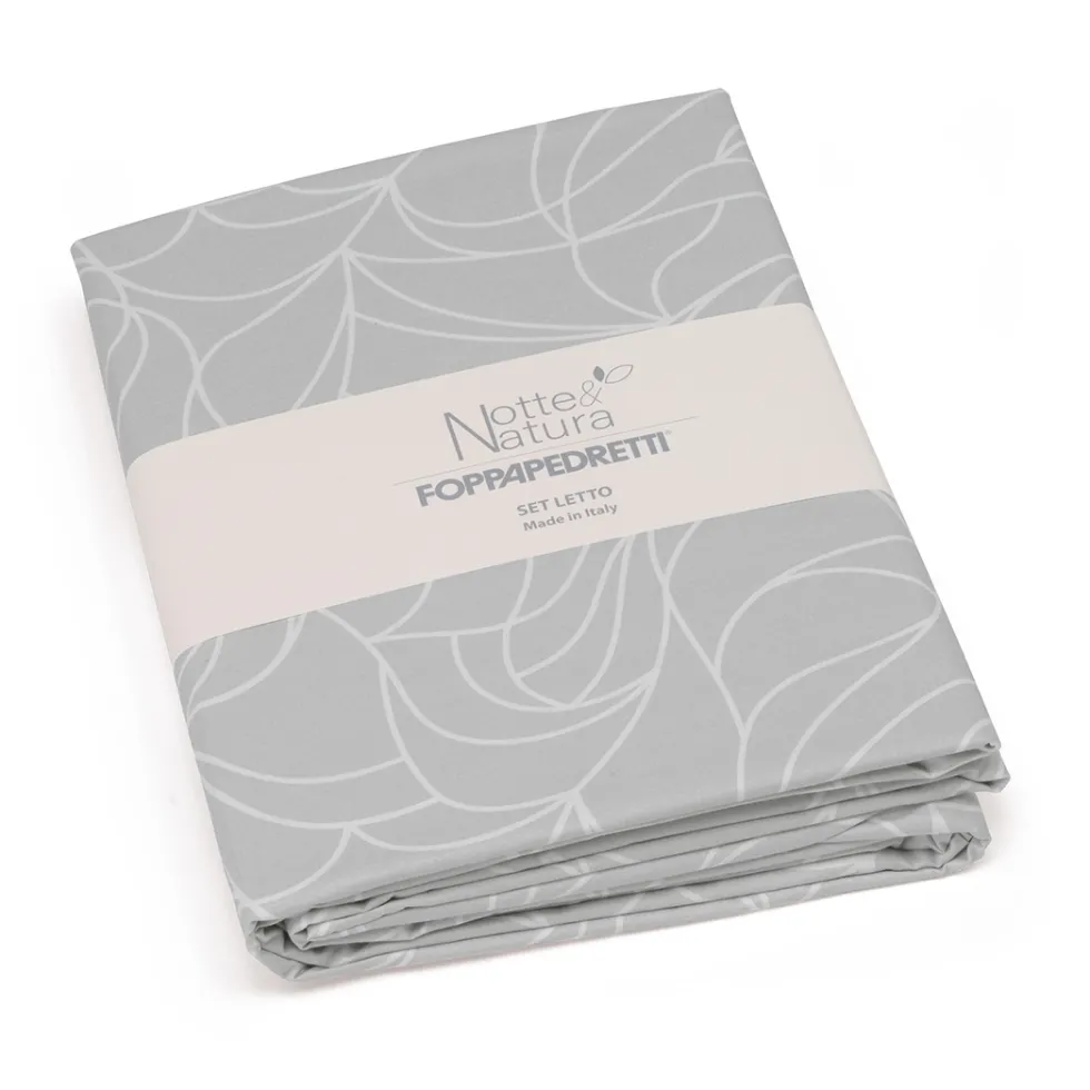 Il completo lenzuola letto matrimoniale di Foppapedretti in percalle di cotone 200, OEKO-TEX Standard 100 – Made in Italy, si compone di 2 federe e lenzuolo sopra stampato, mentre il lenzuolo sotto con angoli è in tinta unita abbinata.