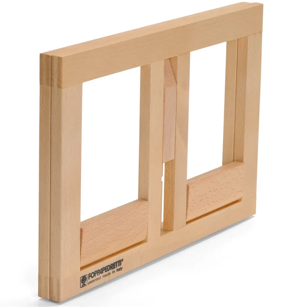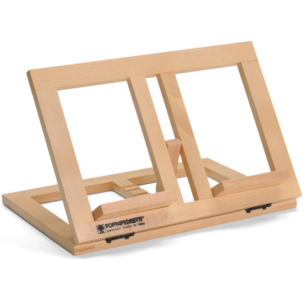 Il leggio chiudibile in legno Reading di Foppapedretti è regolabile a varie altezze e, quando è chiuso, occupa lo spazio di un libro.
