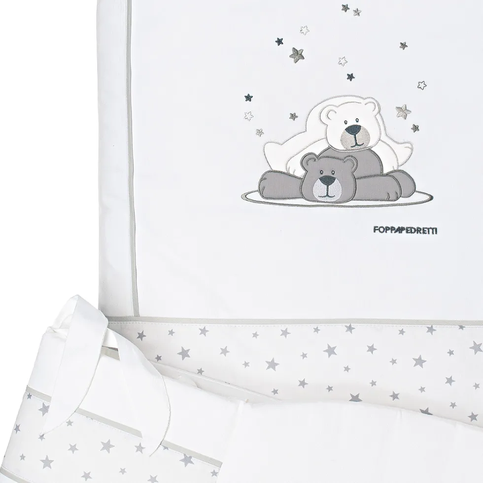 Il completo piumone Pikkoletto Dolcestella di Foppapedretti è caratterizzato da ricami con due teneri orsetti e tante stelline, nelle tinte del grigio oppure del beige. Il set tessile è composto da paracolpi con imbottitura in poliestere 100% e rivestimento in cotone 100%, sacco sfoderabile in cotone 100% e imbottitura in poliestere 100% e federa per cuscino in cotone 100%.