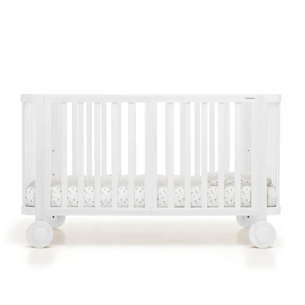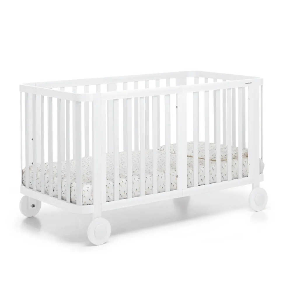 La versione lettino Evo è molto spaziosa, studiata per garantire il massimo comfort e per accompagnare la crescita del bambino. Ha rete a doghe regolabile in altezza in 3 posizioni. Si caratterizza per il design classico e senza tempo, con angoli arrotondati e grandi ruote tonde, ed è realizzato in legno massiccio di alta qualità.