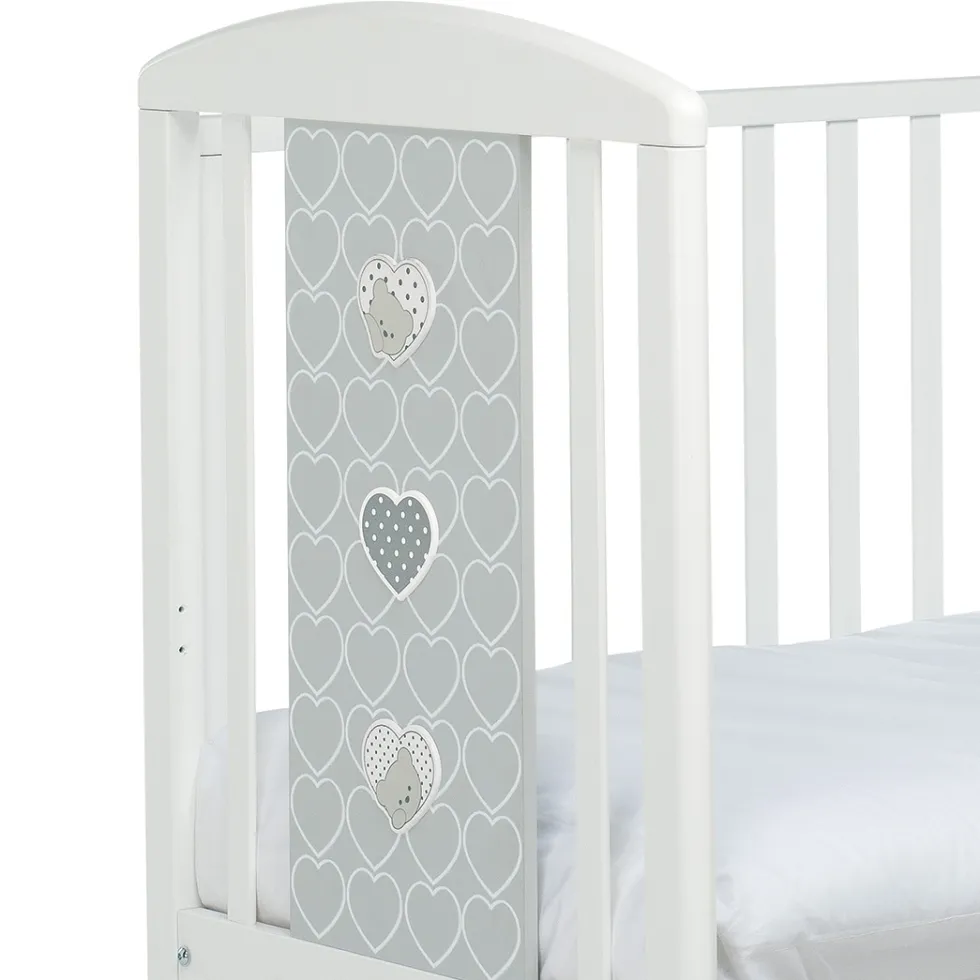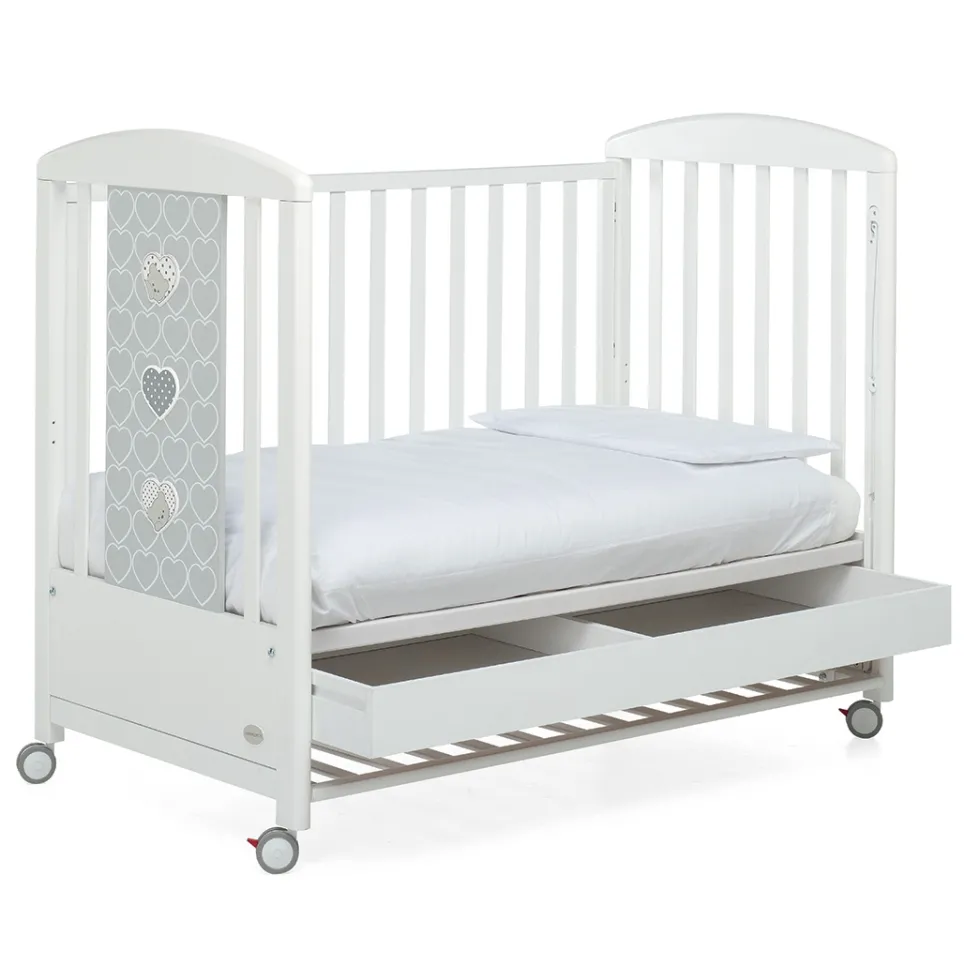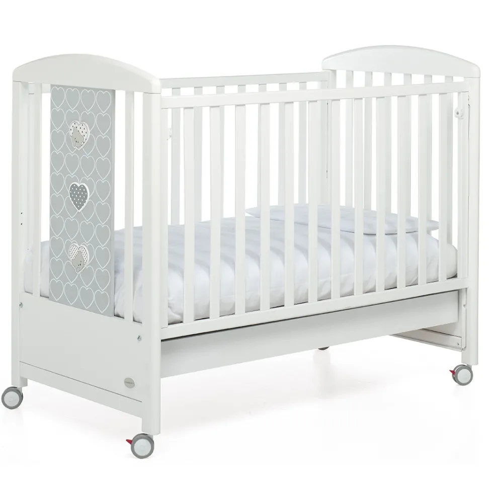 Una delle testate del lettino ha decorazioni con teneri cuori in rilievo che racchiudono un dolcissimo orsetto. Il lettino ha un ampio cassetto inferiore, suddiviso in due scomparti, e ruote gommate antigraffio, con sistema frenante, per facilitare gli spostamenti.