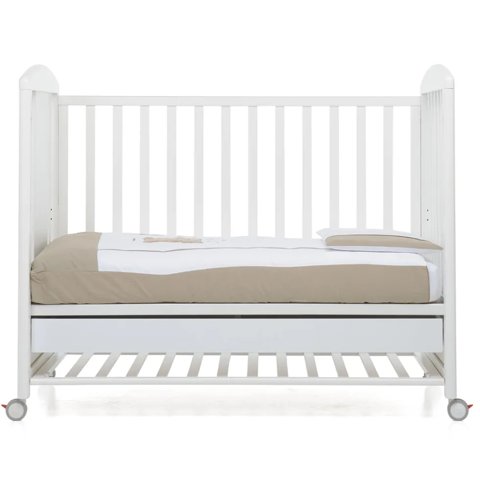 Una testata del lettino, all’insegna del bianco, è decorata con un simpatico orsetto in rilievo e il nome della collezione. Il lettino ha un ampio cassetto inferiore, suddiviso in due scomparti, e ruote gommate antigraffio, con sistema frenante, per facilitare gli spostamenti.