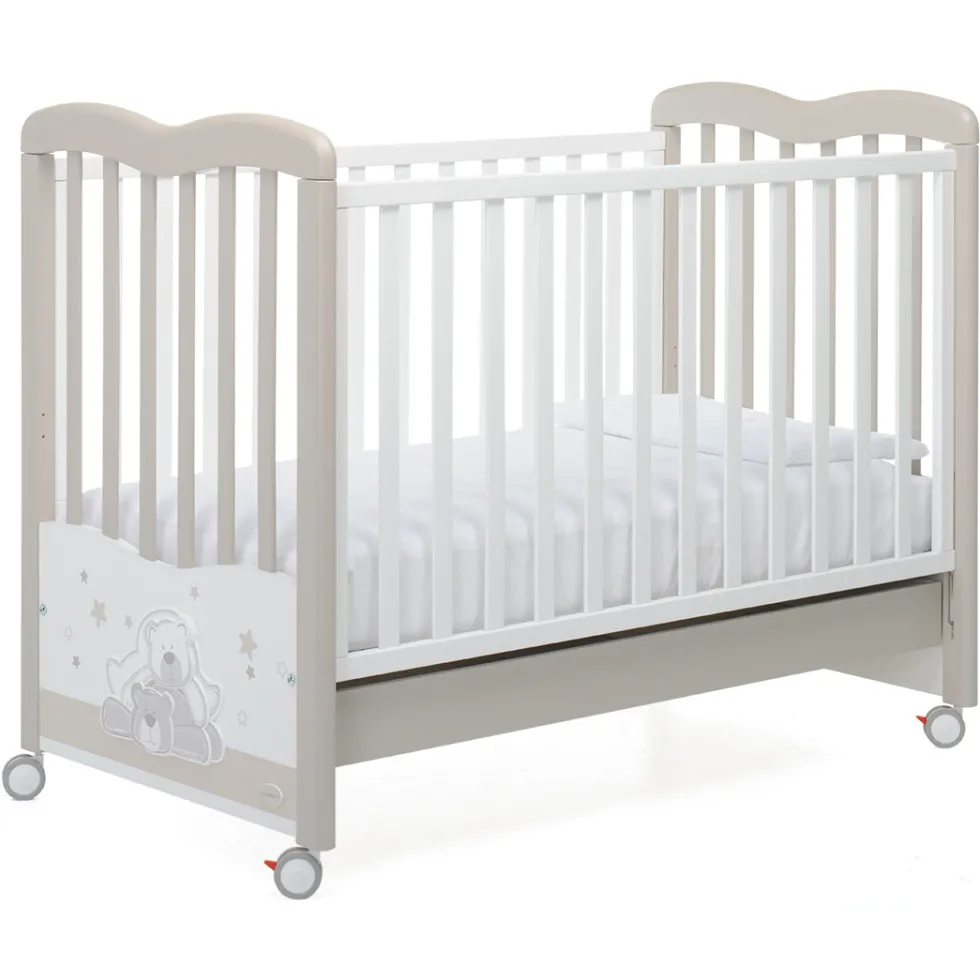 Il lettino in legno Dolcestella tortora di Foppapedretti ha una sponda regolabile a due altezze, per facilitare il riordino del lettino. Anche la rete è regolabile a due altezze, per consentire un pratico uso anche quando il bimbo è neonato. La testata del lettino ha decorazioni con divertenti orsetti e stelline, per un’eleganza classica ideale per dolci sogni. Il lettino ha un ampio cassetto inferiore, suddiviso in due scomparti, e ruote gommate antigraffio, con sistema frenante, per facilitare gli spostamenti.