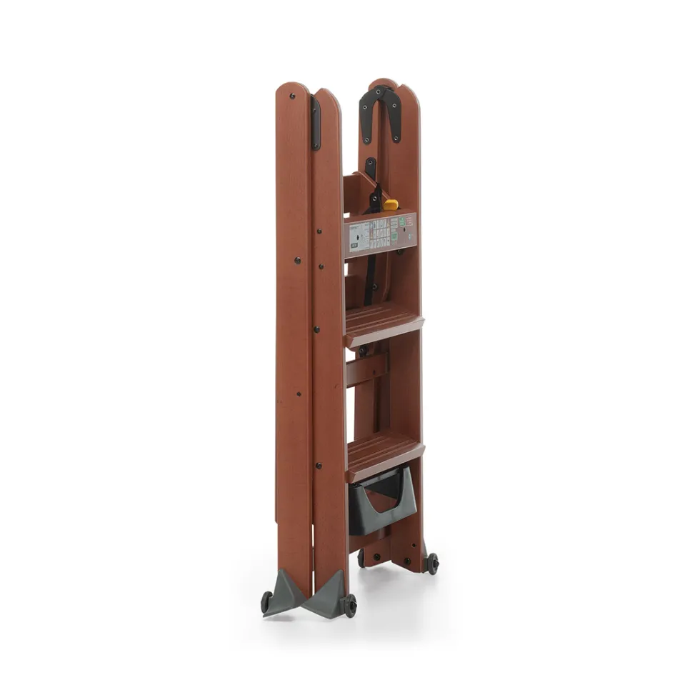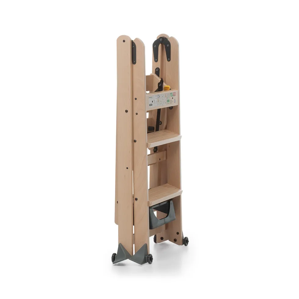 La scala in legno laScala 3.0 di Foppapedretti è solida e sicura: sta in piedi da sola anche quando è chiusa occupando poco spazio. Ha piedini antiribaltamento e gradini antiscivolo.