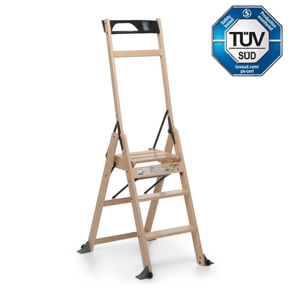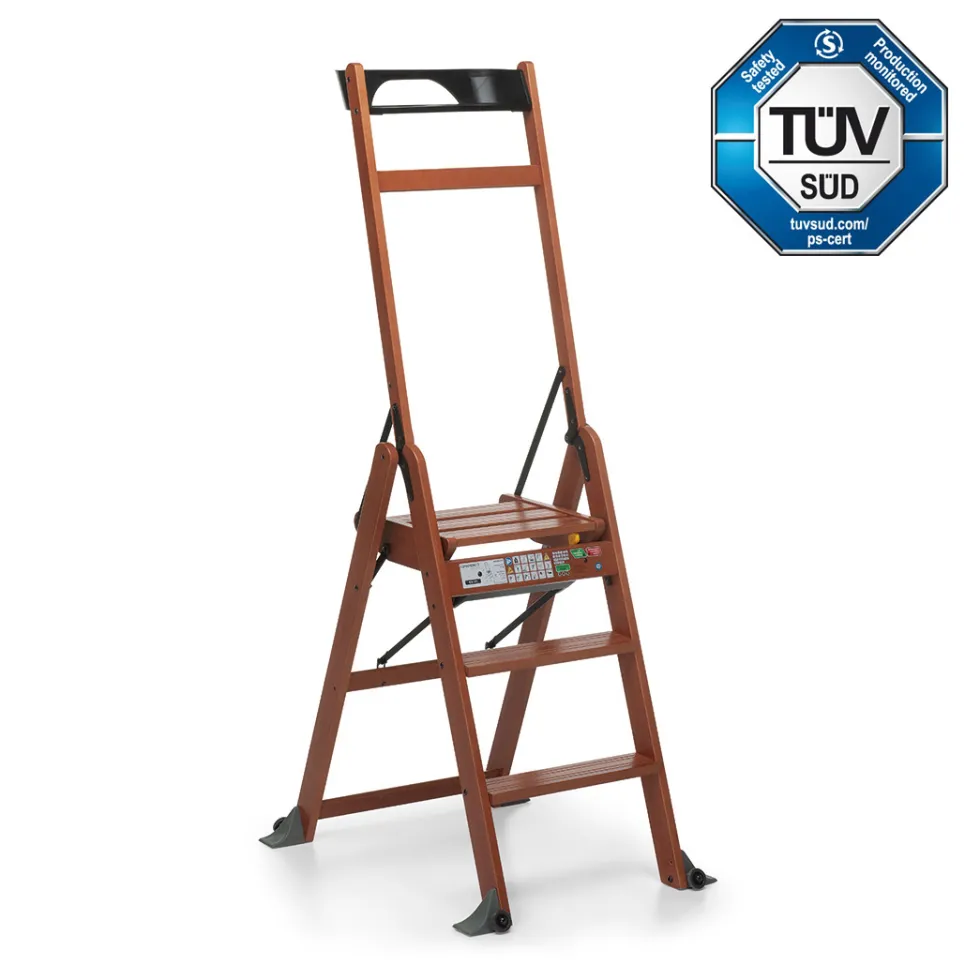 Il sistema di bloccaggio di sicurezza impedisce la chiusura della scala garantendo un appoggio solido e sicuro. Si sposta facilmente grazie alle ruote gommate antigraffio.