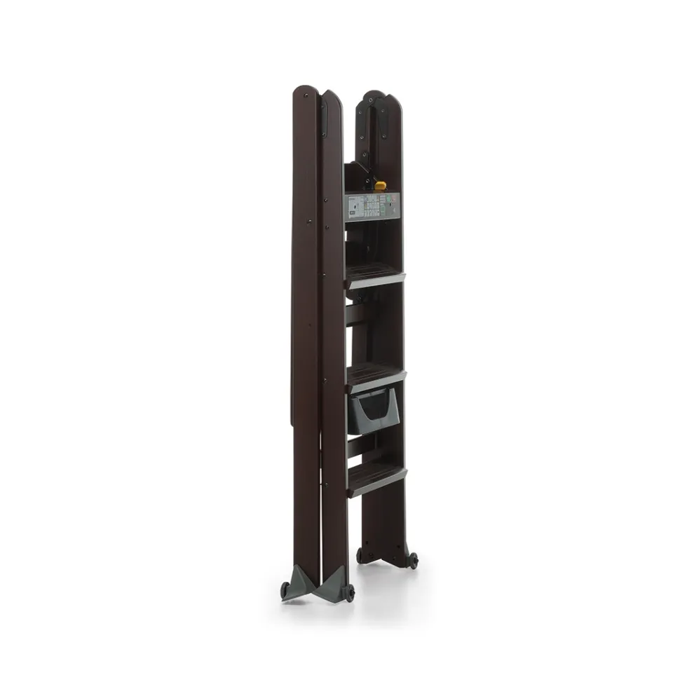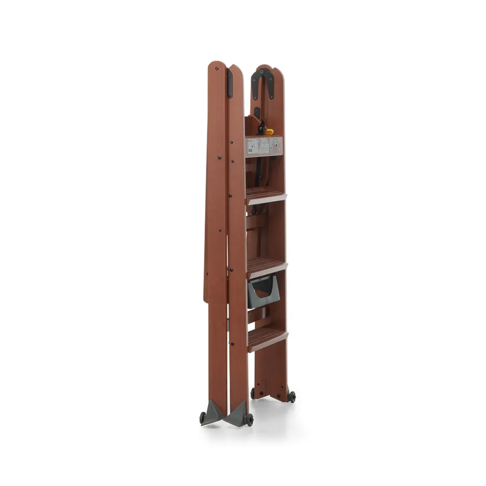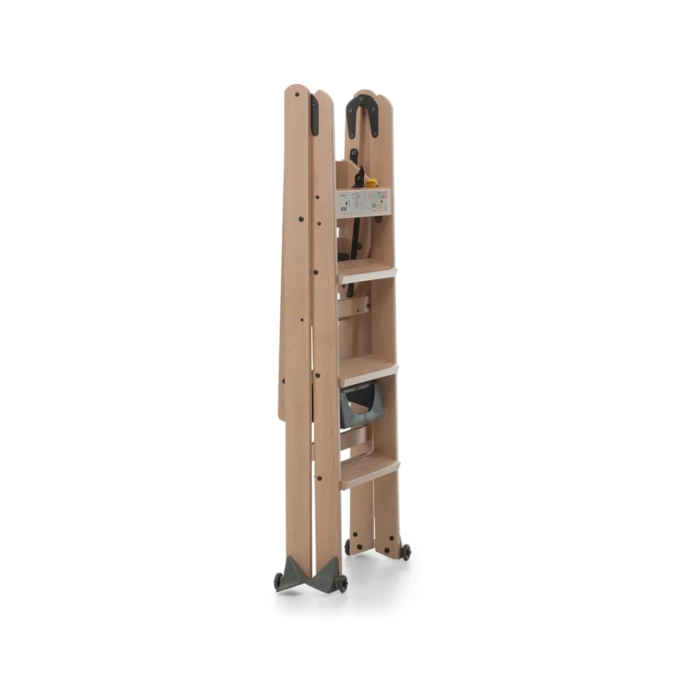 La scala in legno laScala 4.0 di Foppapedretti è solida e sicura: sta in piedi da sola anche quando è chiusa occupando poco spazio. Ha piedini antiribaltamento e gradini antiscivolo.