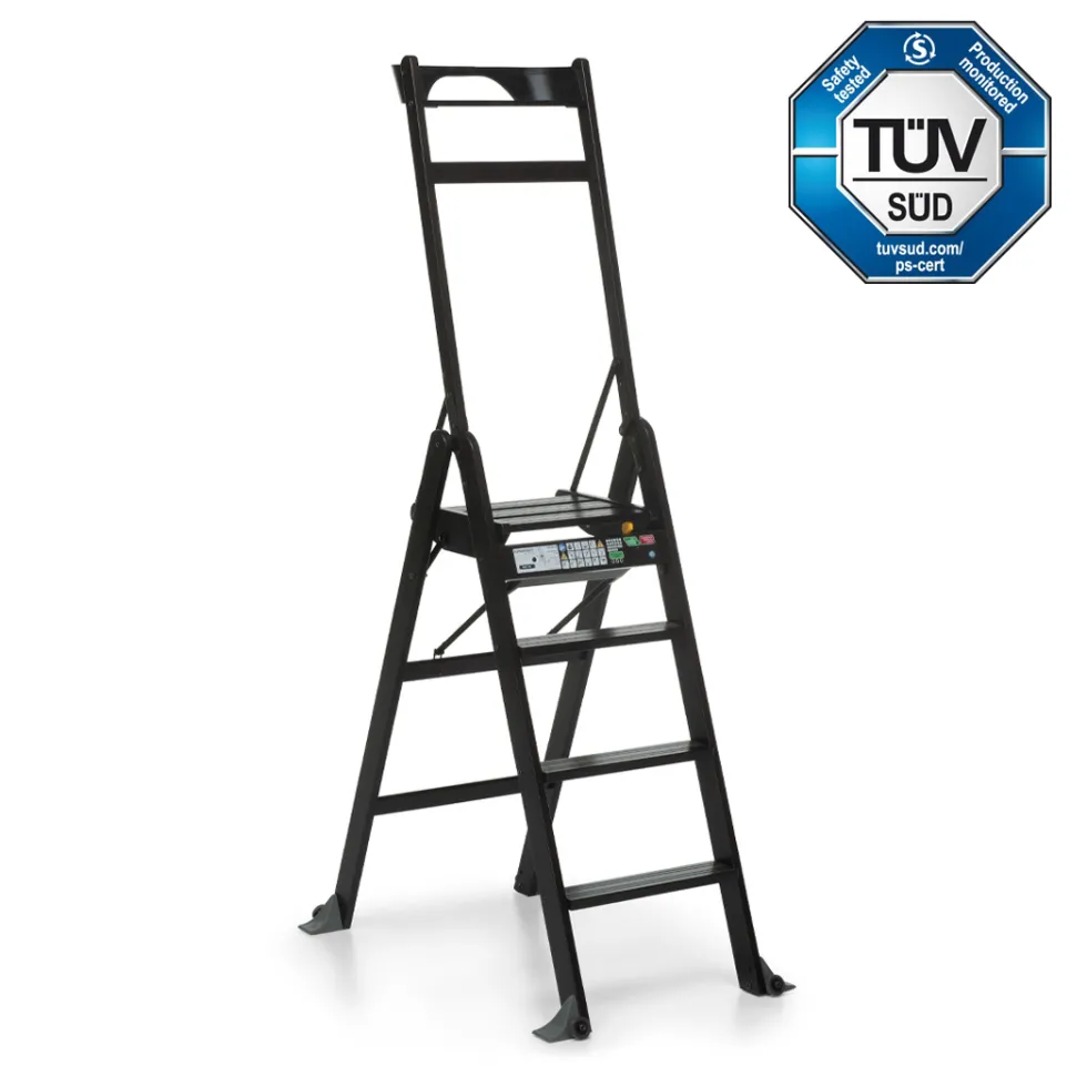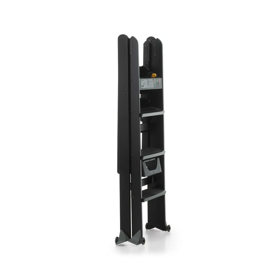 Il sistema di bloccaggio di sicurezza impedisce la chiusura della scala garantendo un appoggio solido e sicuro. Si sposta facilmente grazie alle ruote gommate antigraffio.