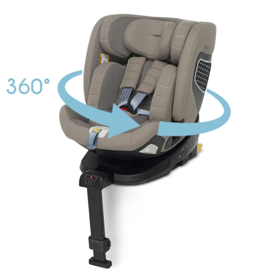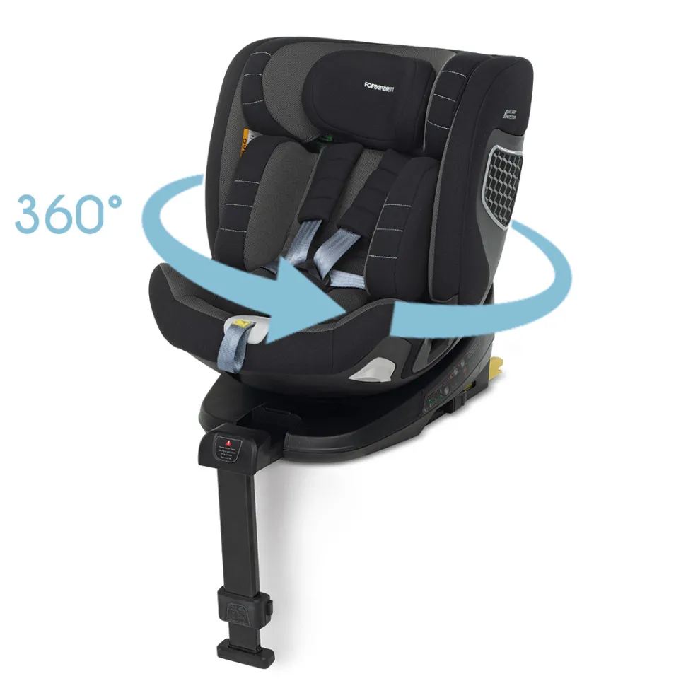 Il seggiolino auto FP360 i-Size di Foppapedretti ha seduta girevole a 360 gradi e reclinabile, che segue la crescita del bambino: è omologato da 40 cm a 150 cm di altezza, dalla nascita a circa 12 anni. Il sistema con seduta girevole Easy Positioning è molto comodo: la seduta può essere ruotata verso la portiera dell’auto, per consentire ai genitori di posizionare agevolmente il bambino.