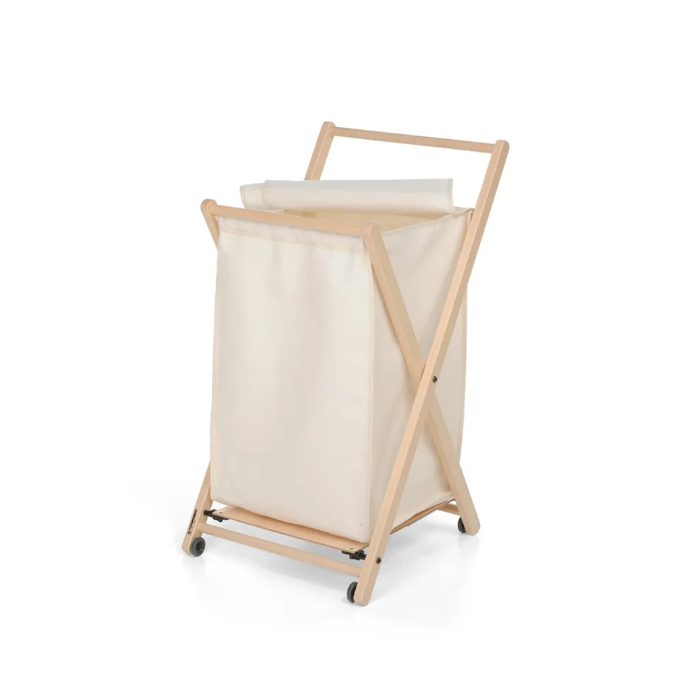 La capiente sacca in cotone (disponibile in vendita anche come ricambio) è asportabile e lavabile. Si sposta facilmente su ruote gommate antigraffio.