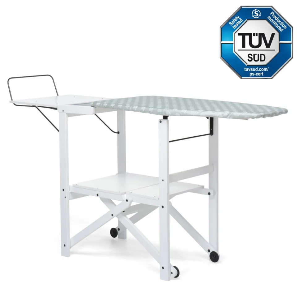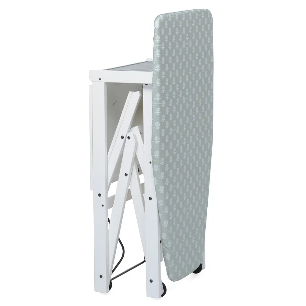 Progettato per fornire il massimo comfort, Asso è anche un grande alleato per tenere in ordine la casa quando non utilizzato: si chiude completamente occupando il minimo spazio, mantenendo il ferro da stiro al suo posto. Le ruote gommate antigraffio permettono di spostarlo con grande facilità.