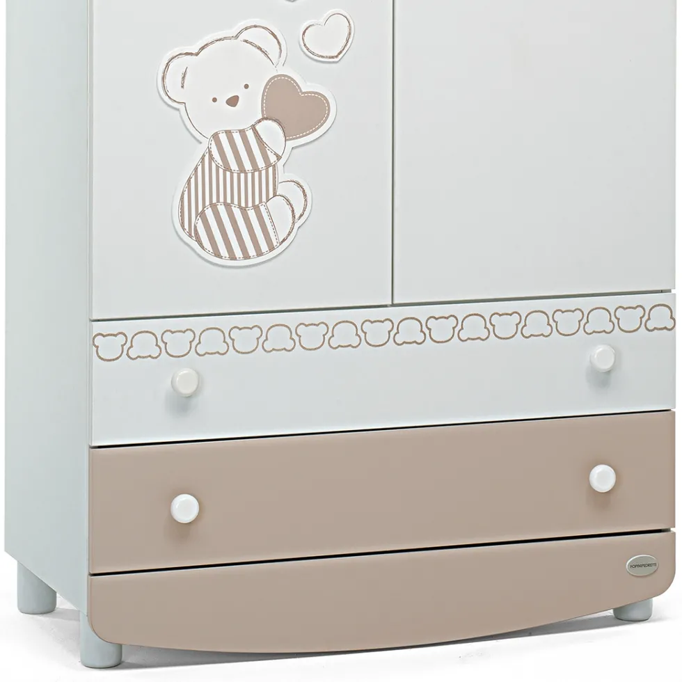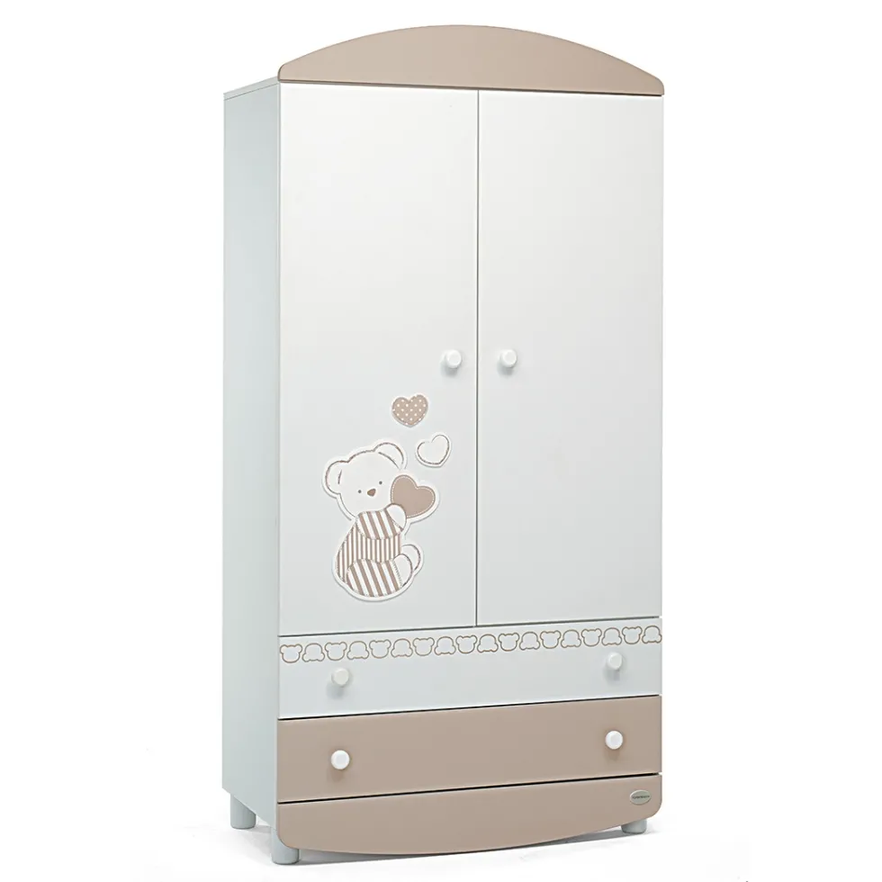 Il capiente armadio in legno a due ante Dolcecuore di Foppapedretti ha due spaziosi cassetti, ampi vani con piani regolabili e due barre appendiabiti.