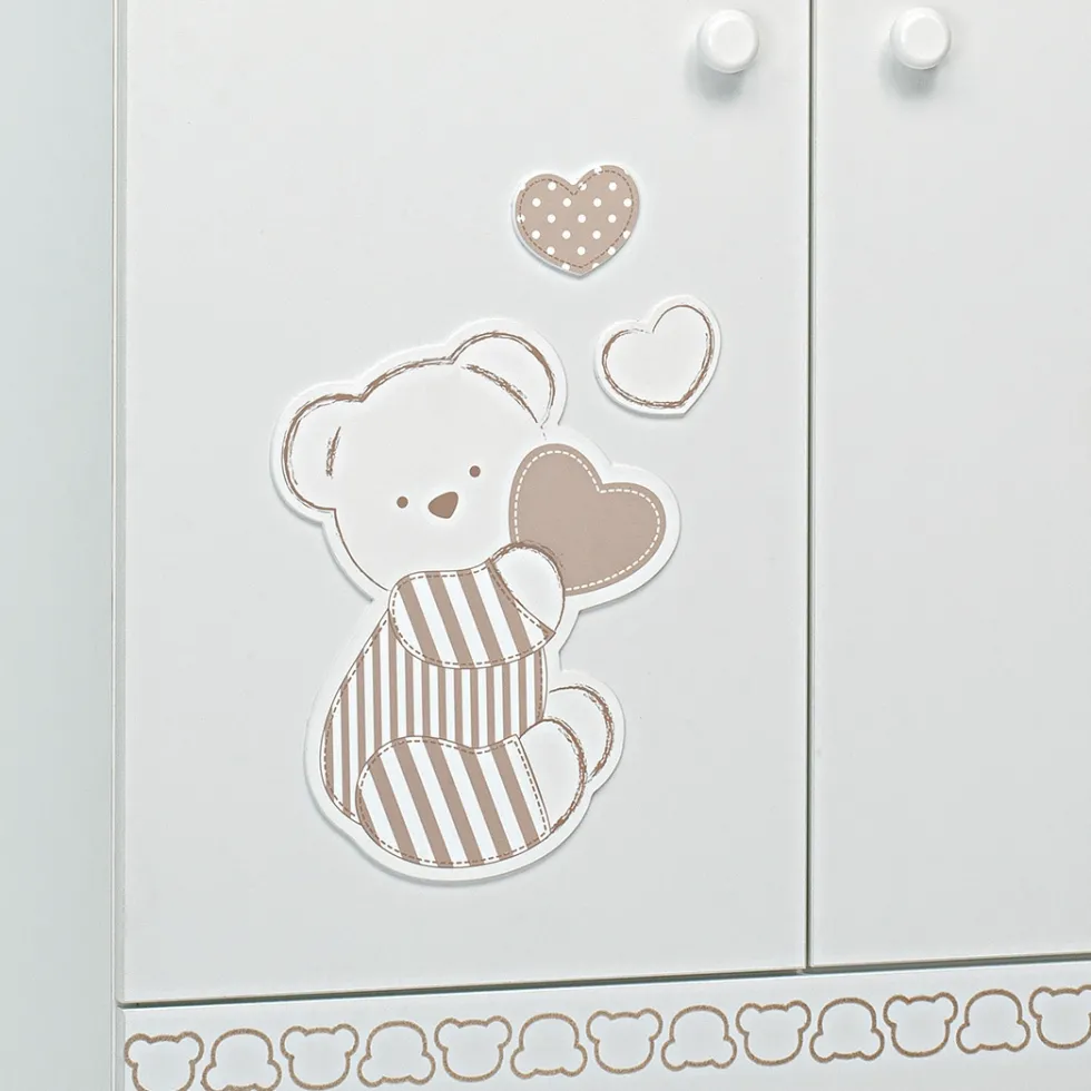 Una delle ante è decorata con il tenero motivo di cuori e orsetto che caratterizza tutta la collezione. Le decorazioni in rilievo hanno un effetto “soft touch” grazie al tessuto floccato piacevole al tatto.
