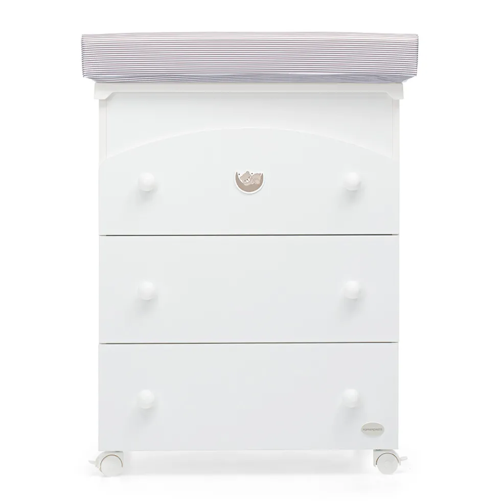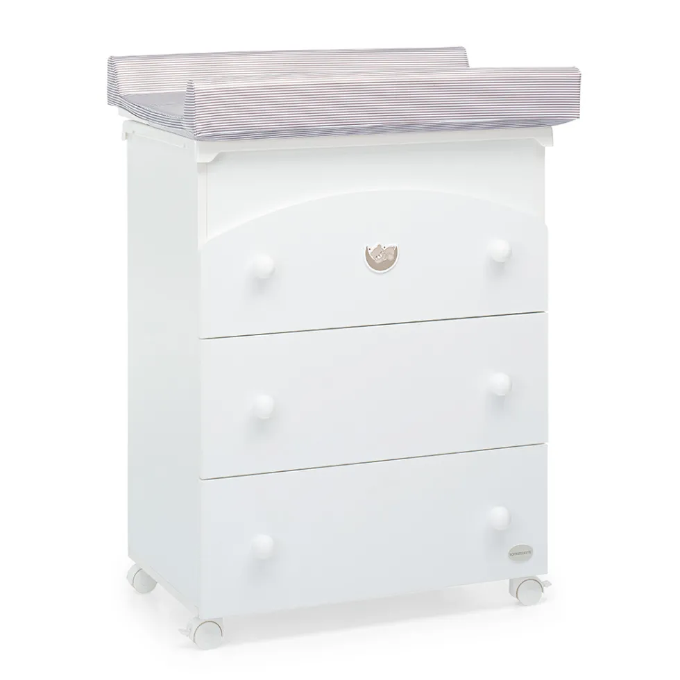 Può essere decorato a piacimento con decoro adesivo in rilievo che rappresenta un dolcissimo orsetto che dorme su una mezzaluna e i cassetti hanno maniglie a forma di pallina. Ha 4 ruote piroettanti, di cui 2 con freno, per facilitare gli spostamenti. E’ inoltre possibile estrarre il cassetto superiore anche con la vaschetta inserita.