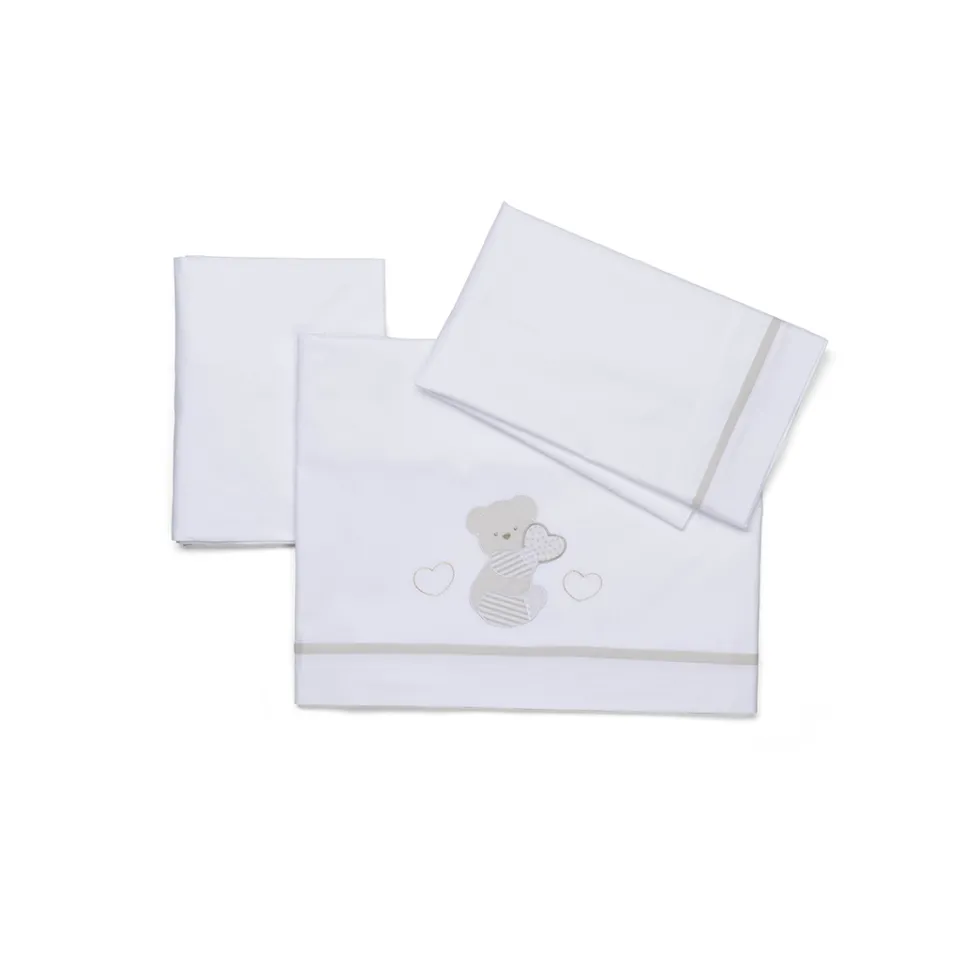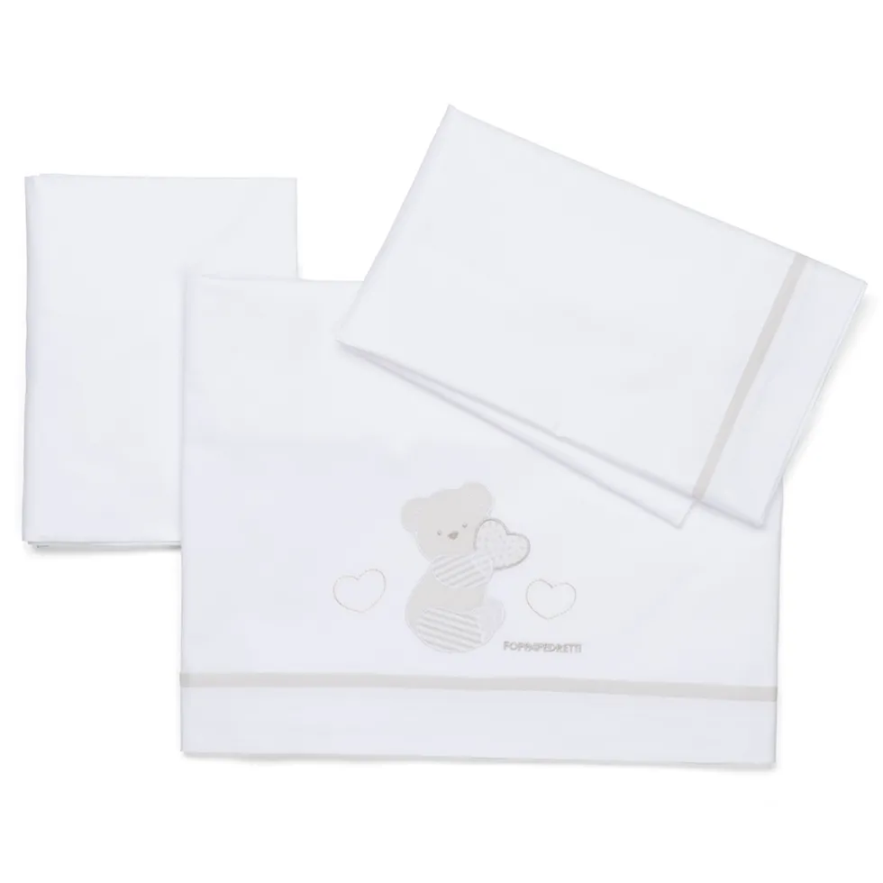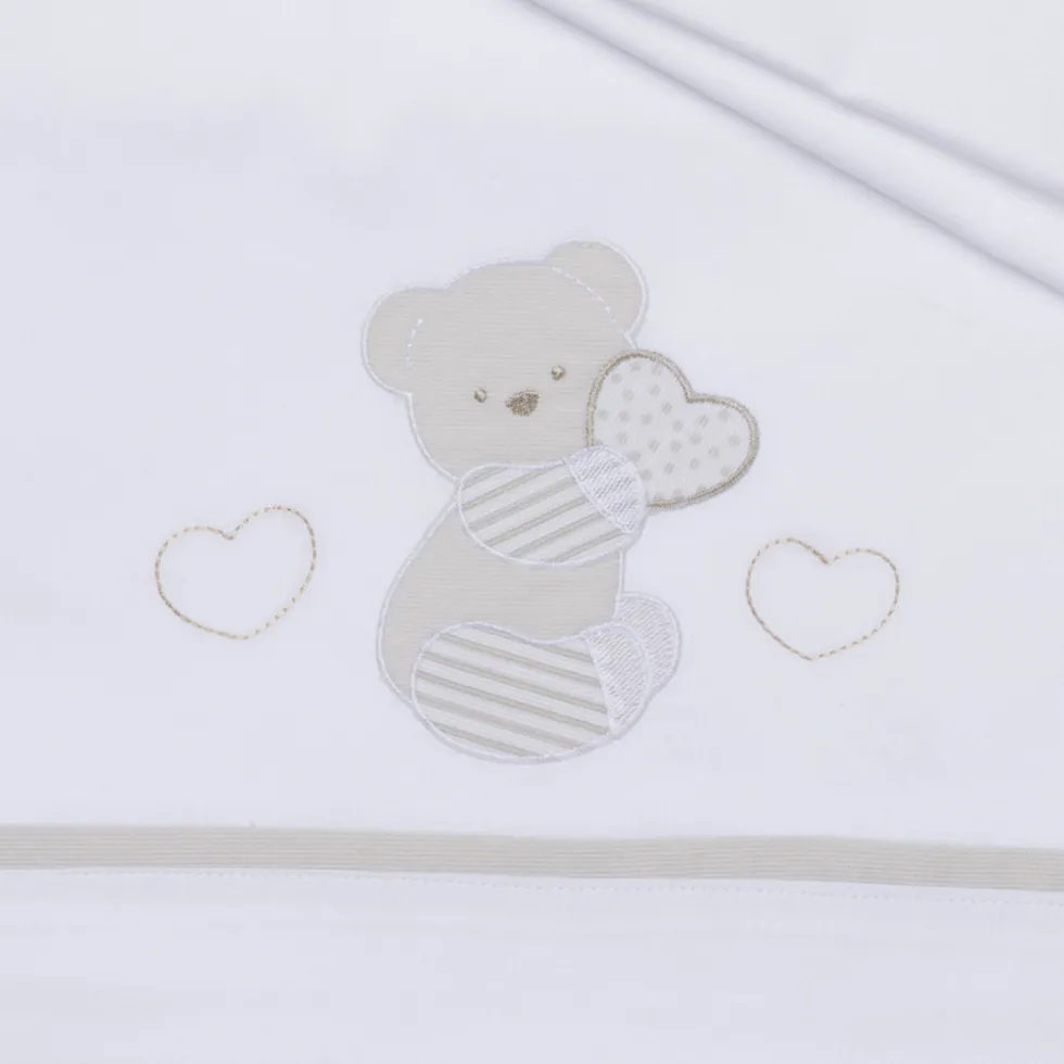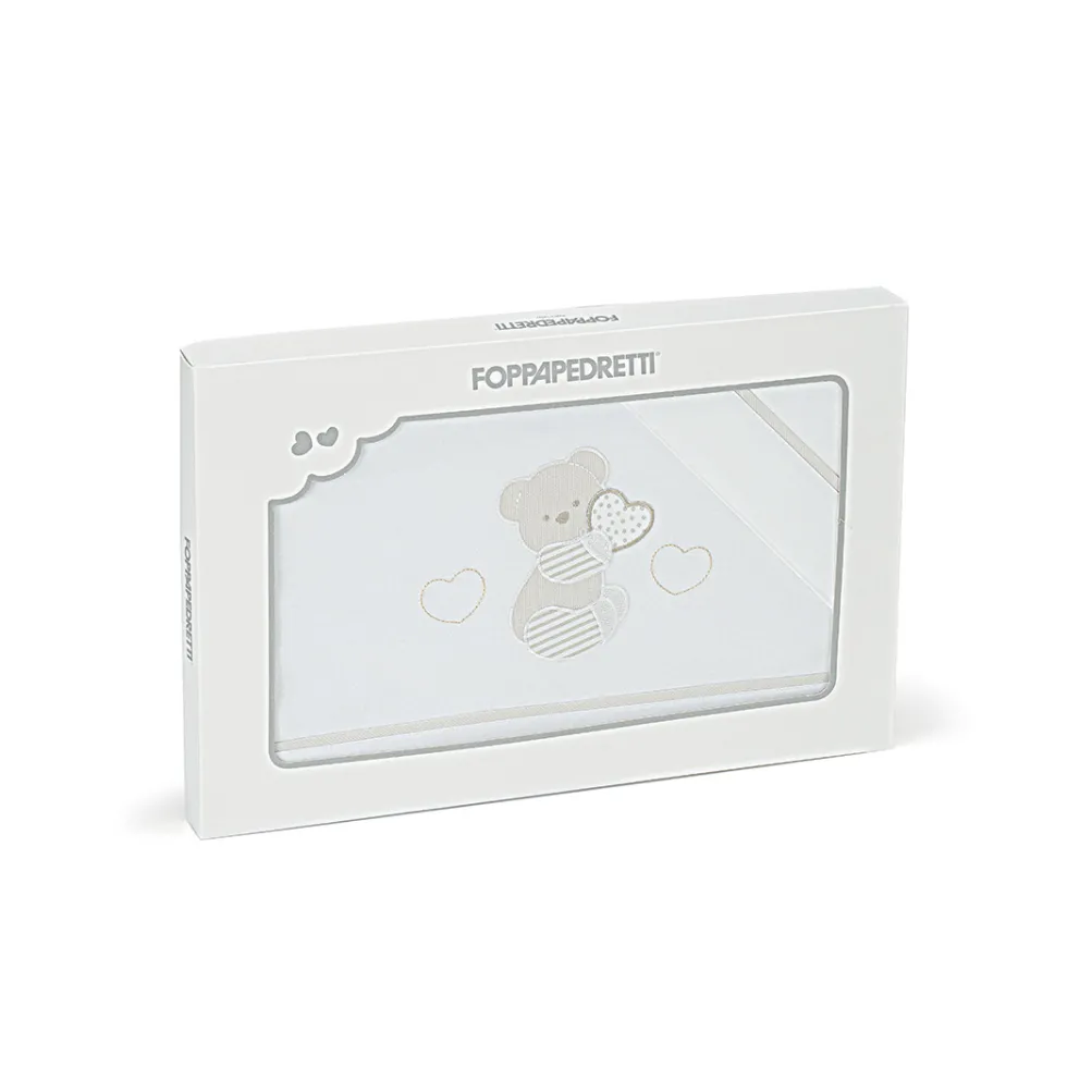 Il completo lenzuolino Dolcecuore di Foppapedretti è caratterizzato da eleganti ricami che richiamano l’orsetto e i cuori della cameretta.