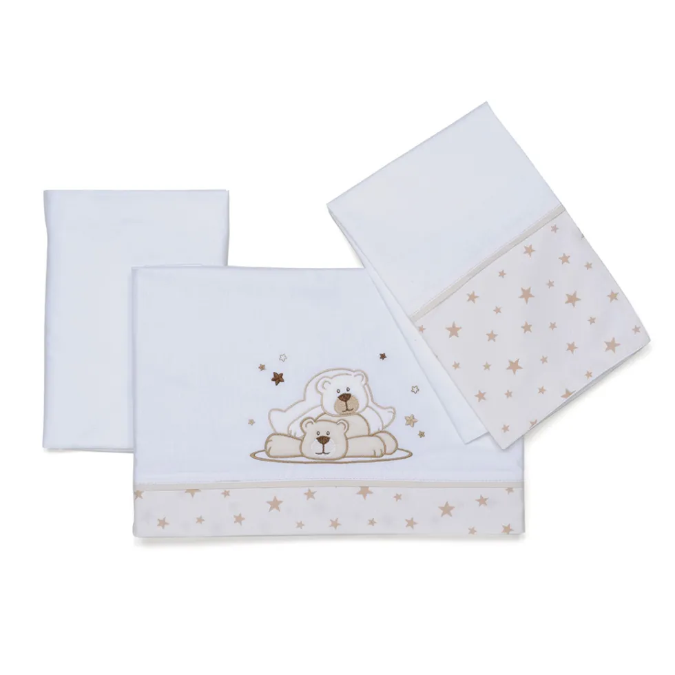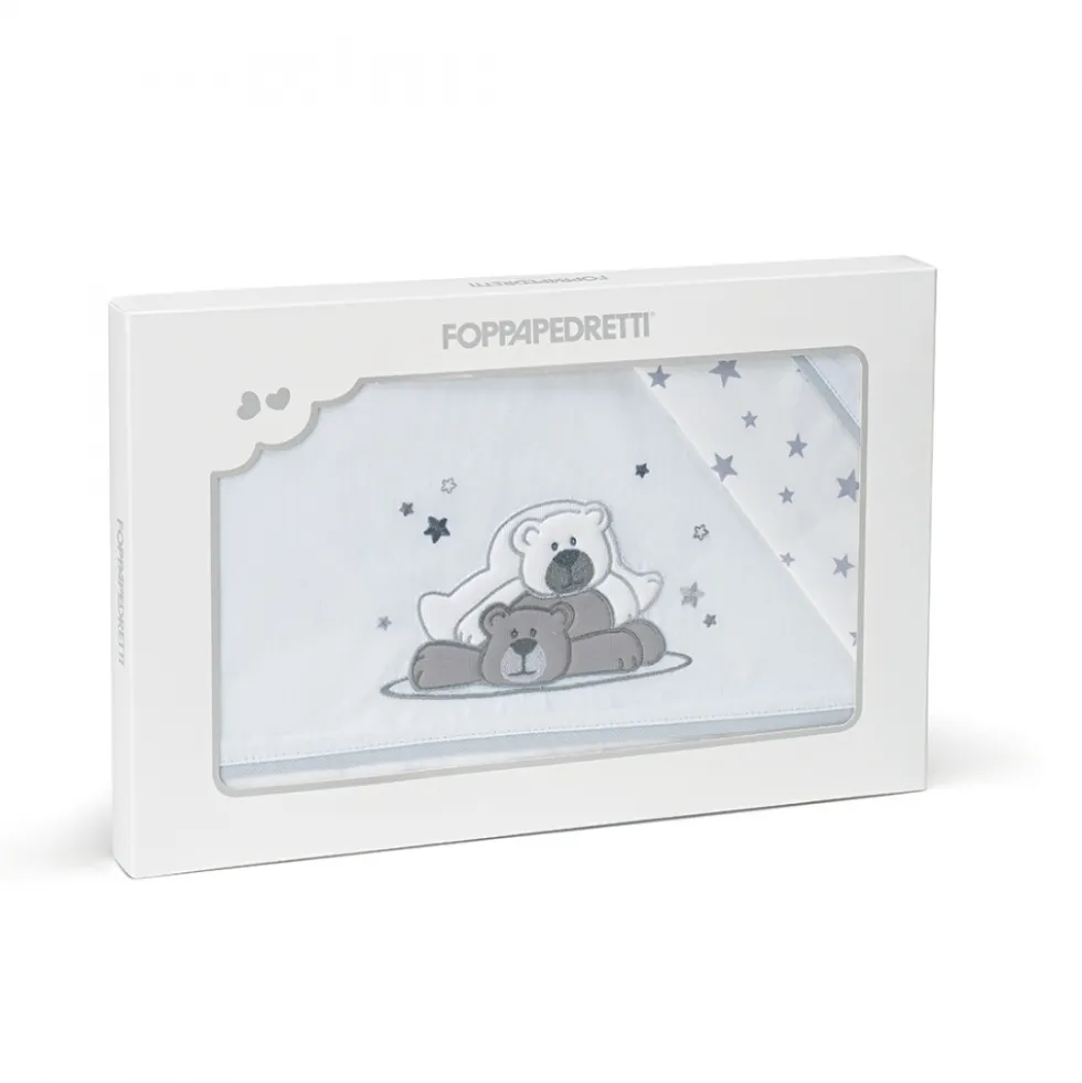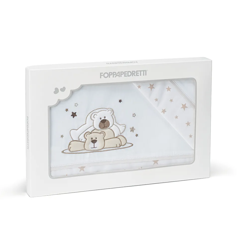 Il completo lenzuola Dolcestella di Foppapedretti è caratterizzato da ricami con i divertenti orsetti giocherelloni e le stelline che contraddistinguono la collezione.