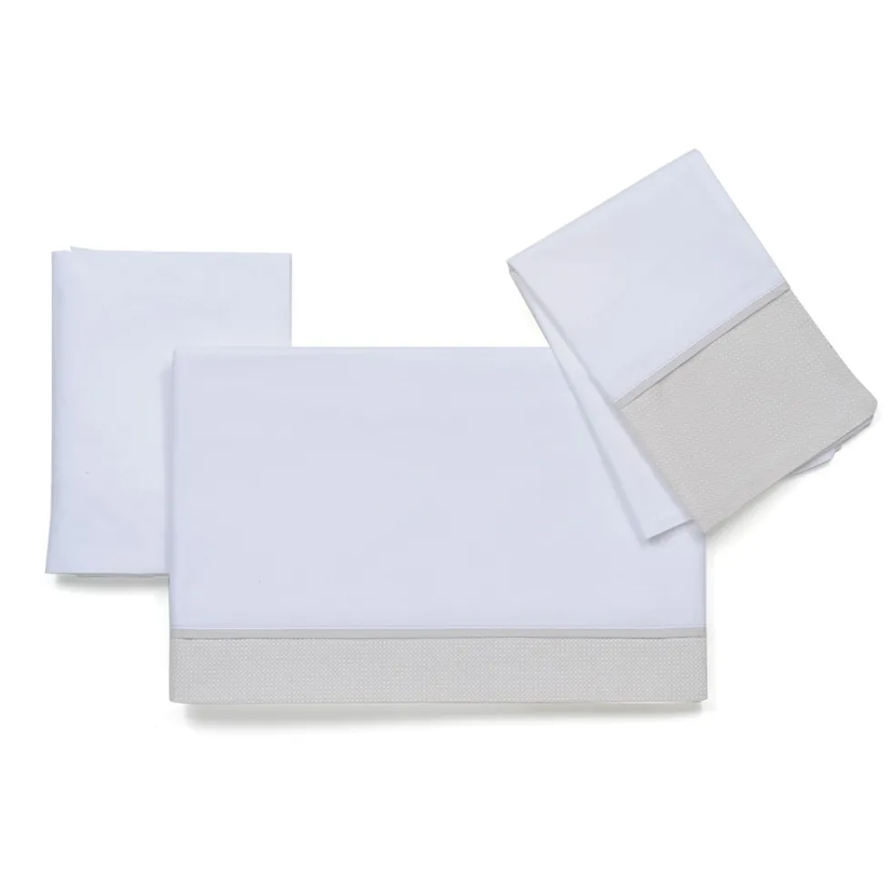 Il completo lenzuolino Pikkoletto di Foppapedretti è caratterizzato da ricami classici nelle tinte del grigio oppure del beige.