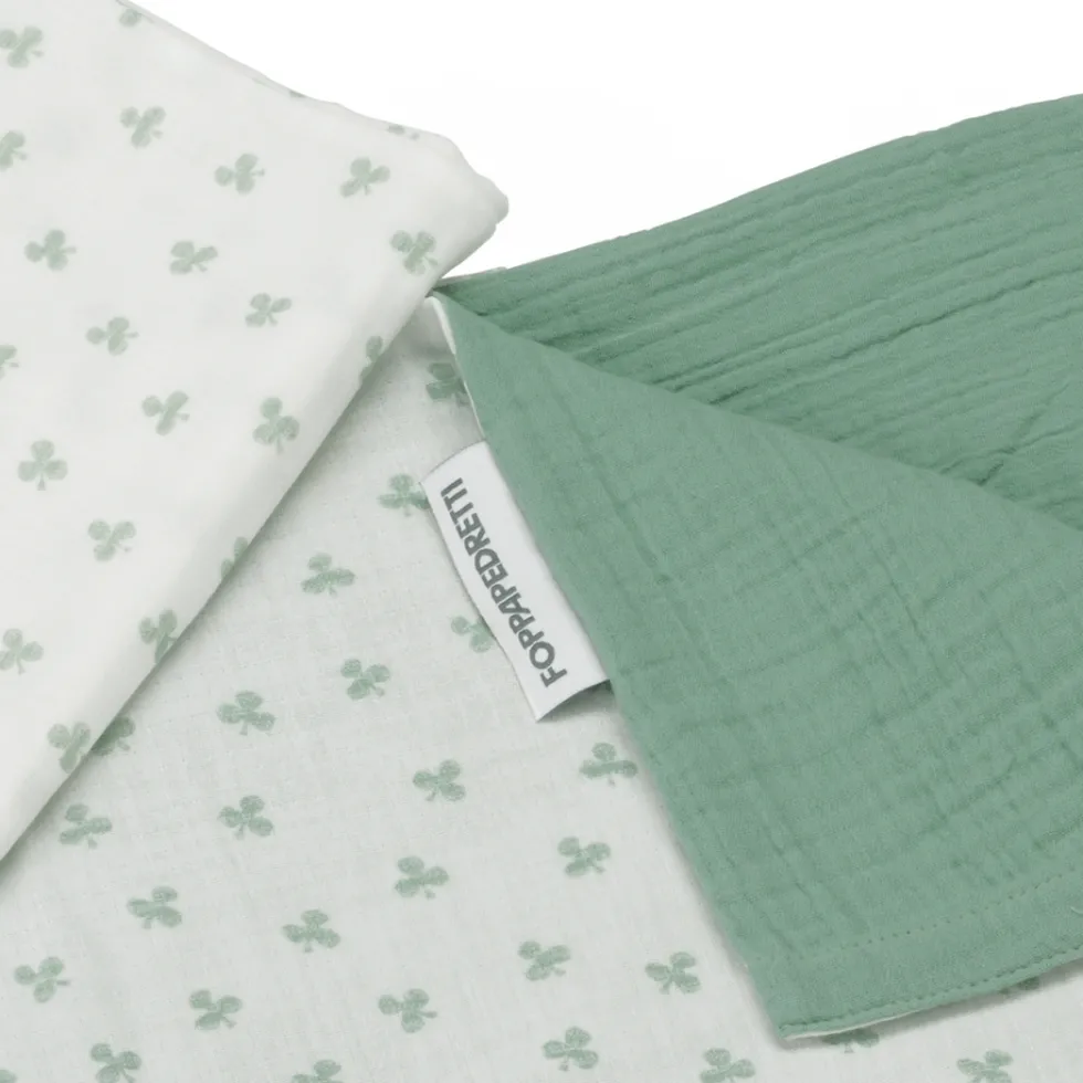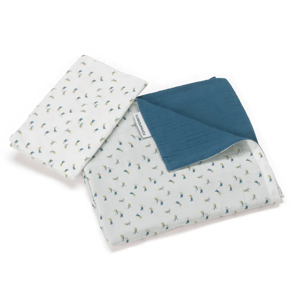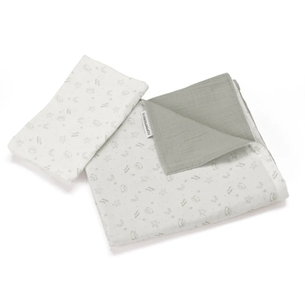 Il completo piumone double-face per lettino di Foppapedretti Mammamia Collection è realizzato in mussola 100% cotone Oeko Tex ed è composto da fodera per piumino 100×150 cm e federa 35×57 cm per lettini.