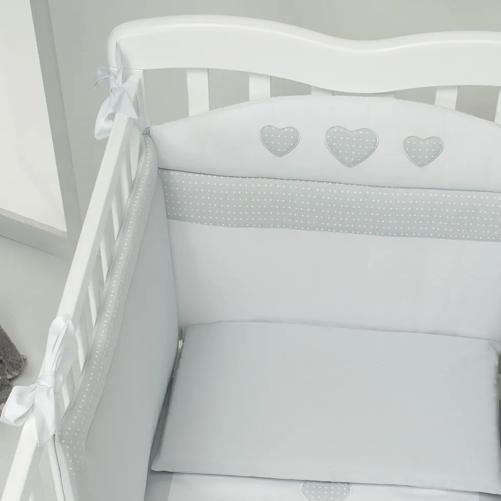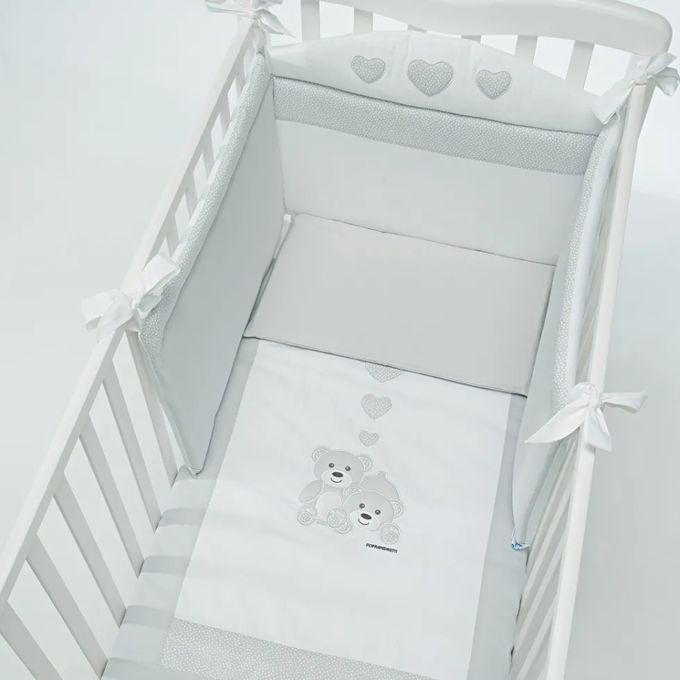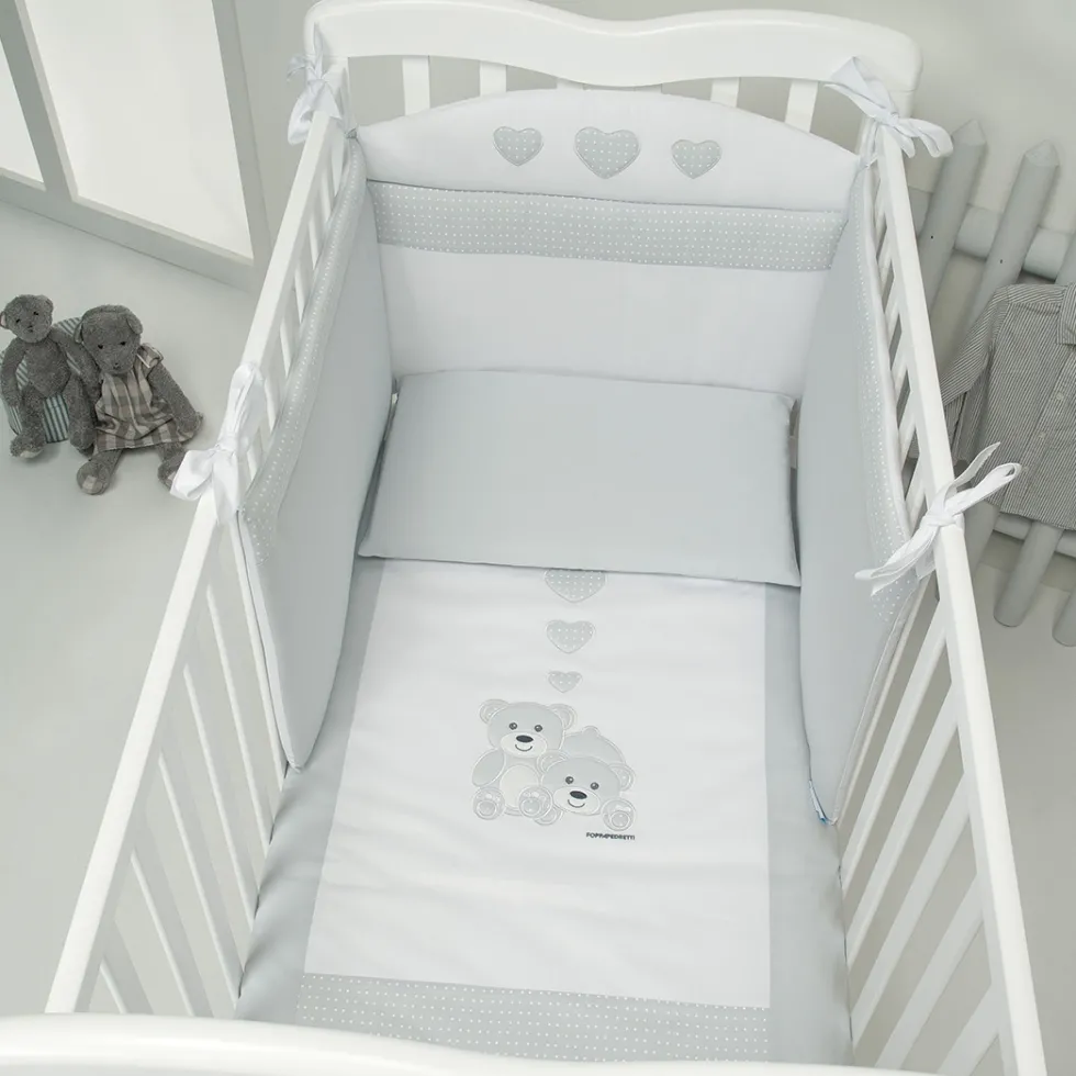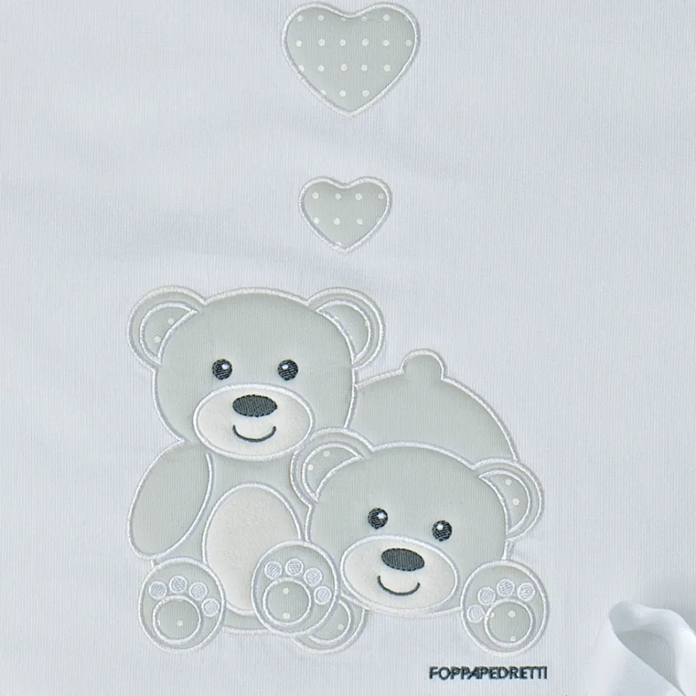 Il completo piumone Tenerorso di Foppapedretti è caratterizzato da raffinati ricami che richiamano due teneri orsetti insieme a dei cuoricini nello stesso tono di grigio.
