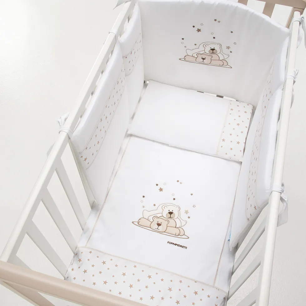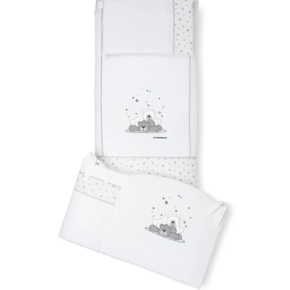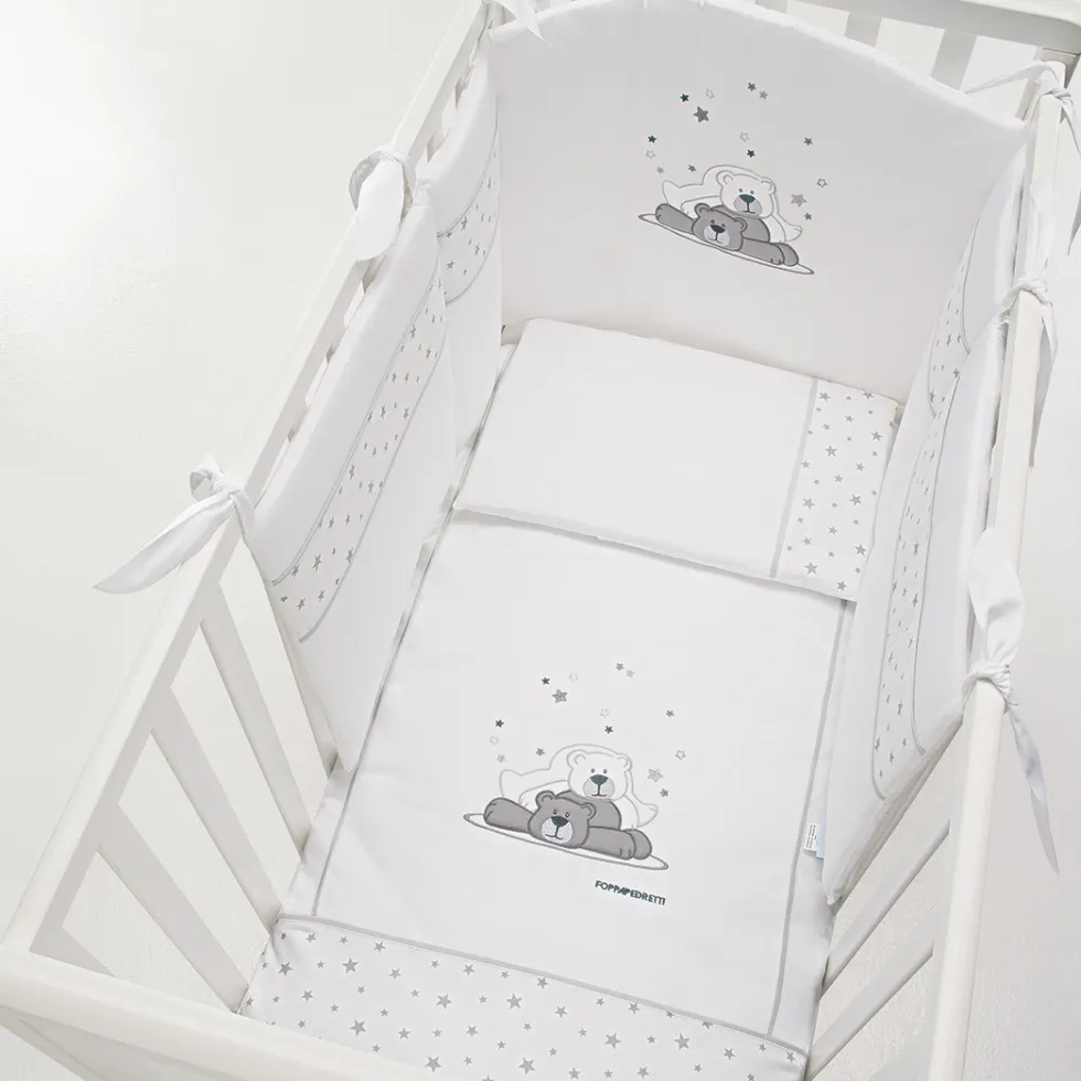 Il completo piumone Pikkoletto Dolcestella di Foppapedretti è caratterizzato da ricami con due teneri orsetti e tante stelline, nelle tinte del grigio oppure del beige. Il set tessile è composto da paracolpi con imbottitura in poliestere 100% e rivestimento in cotone 100%, sacco sfoderabile in cotone 100% e imbottitura in poliestere 100% e federa per cuscino in cotone 100%.