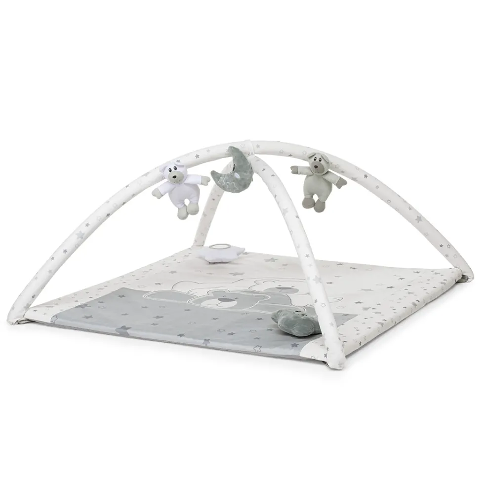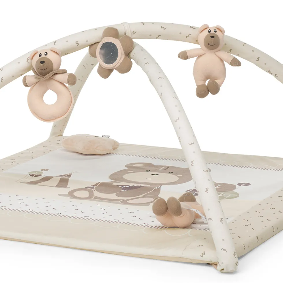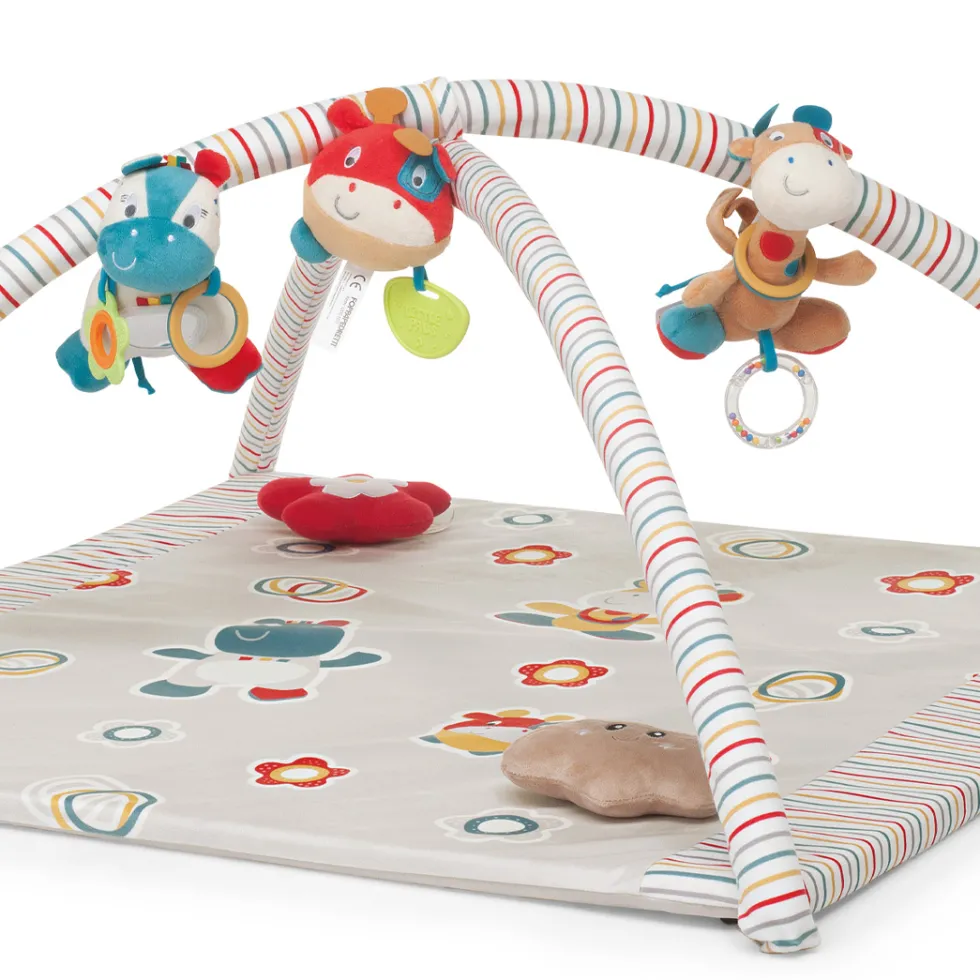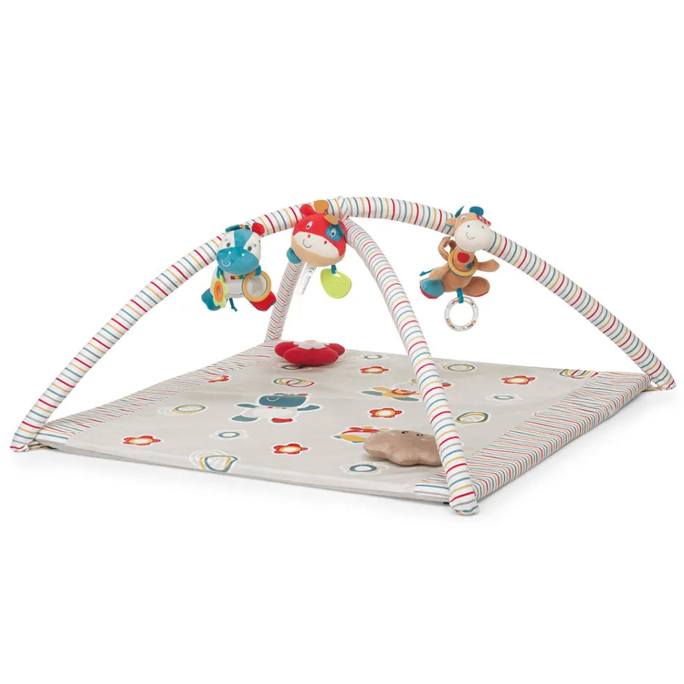 Il tappeto gioco con palestrina Trainer di Foppapedretti si utilizza dalla nascita: è ideale per stimolare il neonato con giochini sensoriali e peluche, sia sul tappetino sia sugli archi rimovibili. L’ampio tappeto è imbottito e morbido al tatto, è sfoderatile e facilmente lavabile, i giochi con velcro sono riposizionabili.