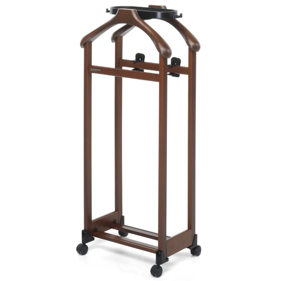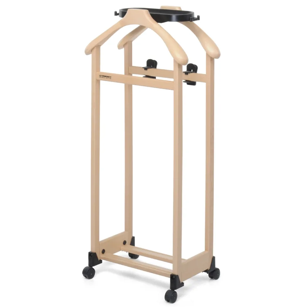 L’indossatore in legno IlMettinsieme di Foppapedretti è un servomuto con due spalle per appendere giacche e camicie, una staffa porta pantaloni e un’altra con pinze regolabili per appendere le gonne.