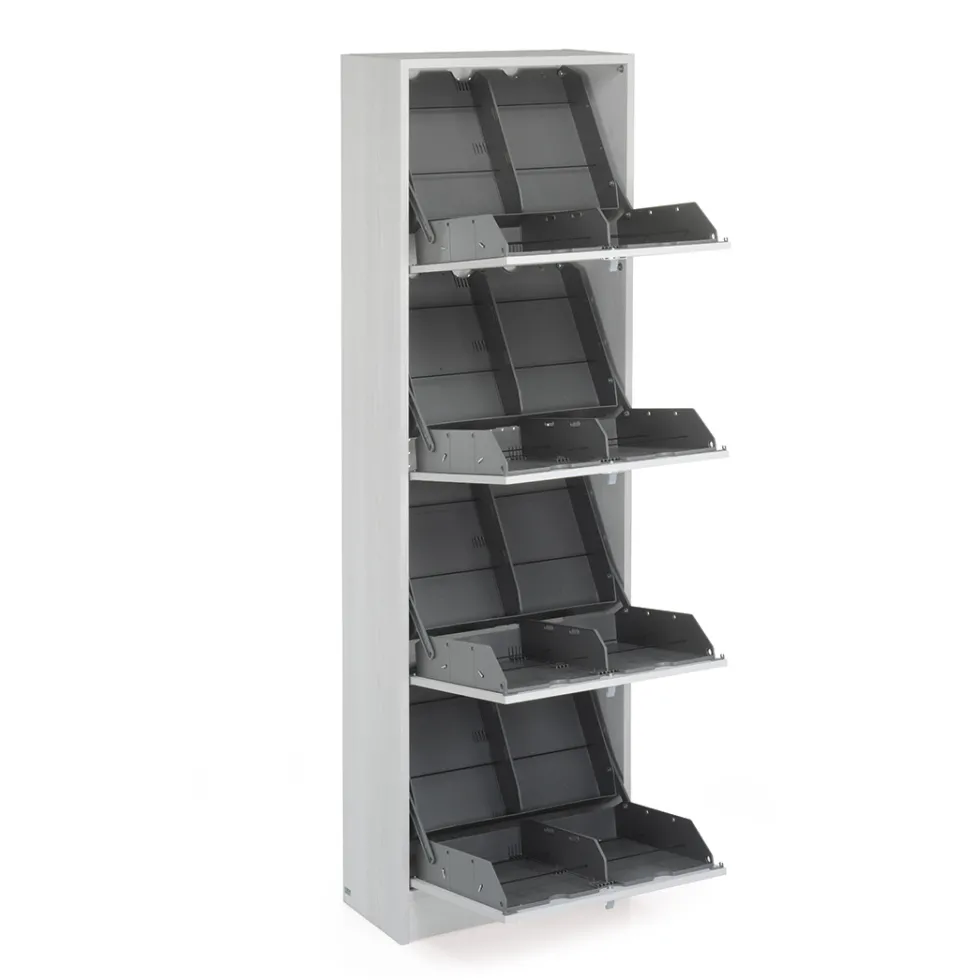 Cenerentola 16 di Foppapedretti è un mobile scarpiera modulare che contiene fino a 16 paia di scarpe (taglia massima compatibile 44 compresa). La struttura solida e robusta e il design elegante e essenziale la rendono adattabile a tutti gli stili di arredamento: Cenerentola è modulare e disponibile in varie dimensioni e colori. Per garantire la massima funzionalità, Cenerentola ha vaschette facilmente lavabili, con elastici ferma scarpe, apertura facilitata dalle maniglie in dotazione e separatore regolabile in larghezza che permette di adattare il vano in funzione della dimensione delle scarpe. Areazione assicurata grazie al pannello schienale traspirante. Il prodotto è Made in Italy e viene consegnato già assemblato.