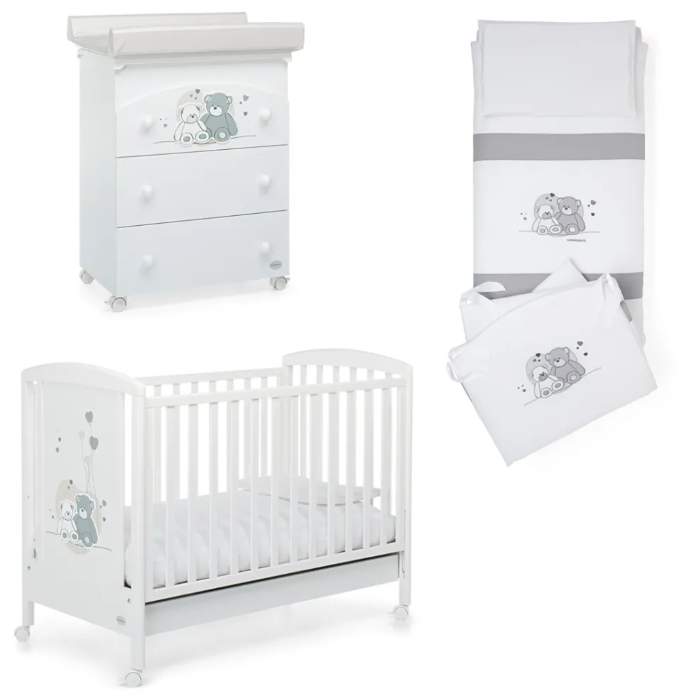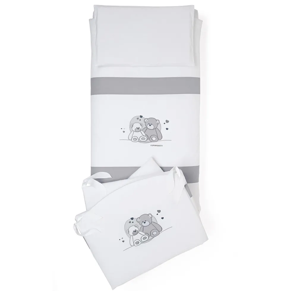 Il completo piumone Mascotte di Foppapedretti è caratterizzato da ricami con due teneri orsetti e cuoricini, nelle tonalità del grigio. Il set tessile è composto da paracolpi con imbottitura in poliestere 100% e rivestimento in cotone 100%, sacco sfoderabile in cotone 100% e imbottitura in poliestere 100% e federa per cuscino in cotone 100%.