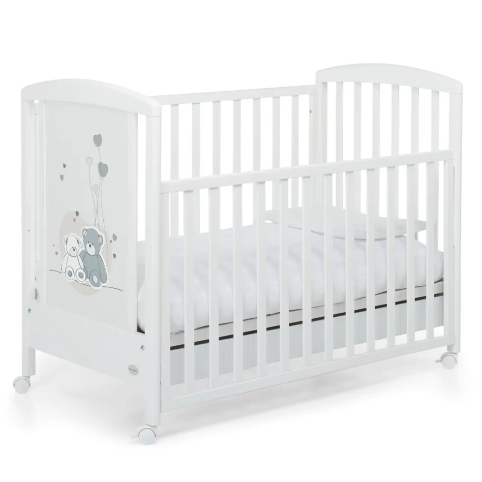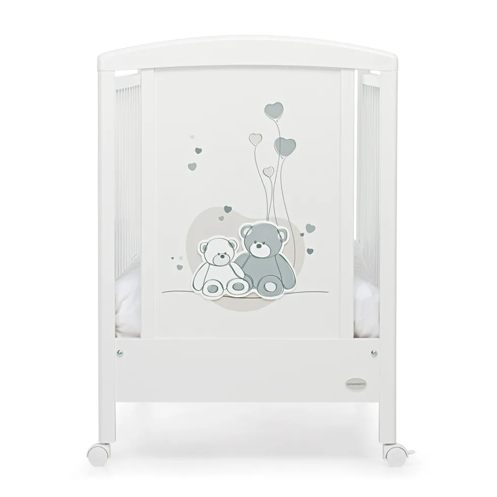 Una testata del lettino è caratterizzata da un tenero decoro, nelle tonalità del grigio, con due dolci orsetti in rilievo e tanti cuoricini. Il lettino ha un ampio cassetto inferiore e 4 ruote piroettanti, di cui due con freno, per facilitare gli spostamenti.