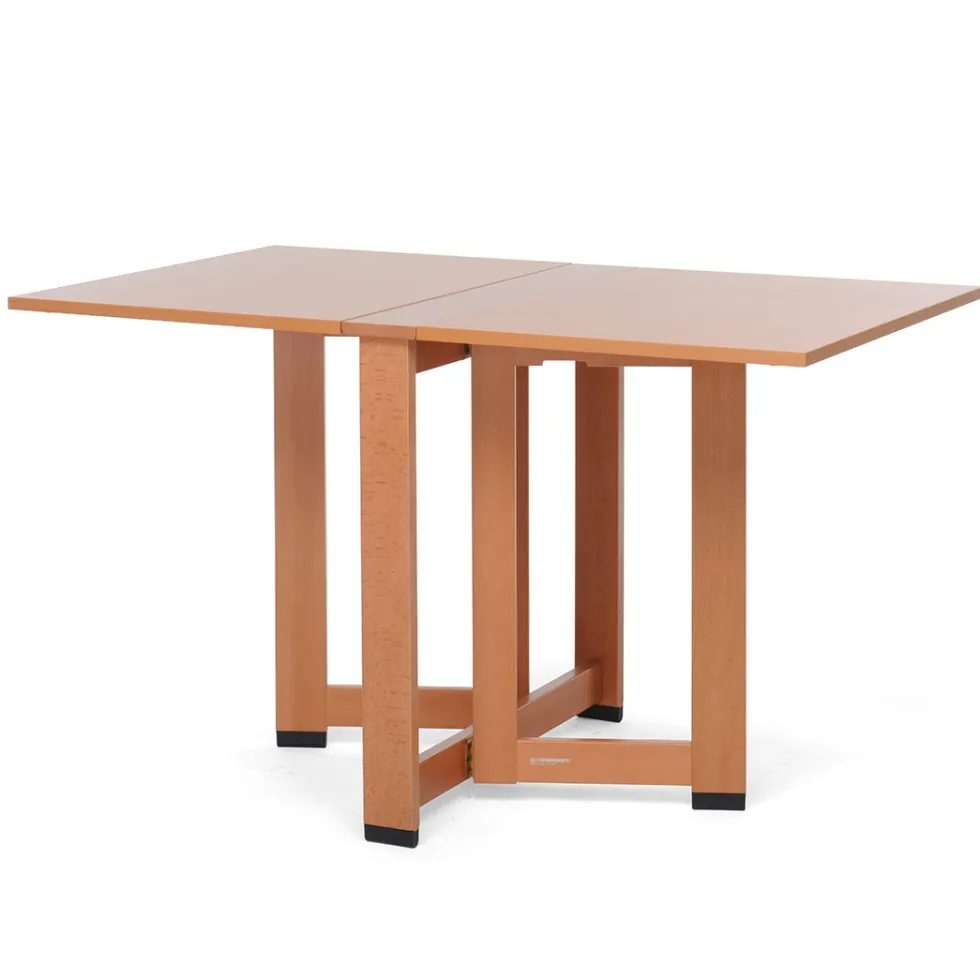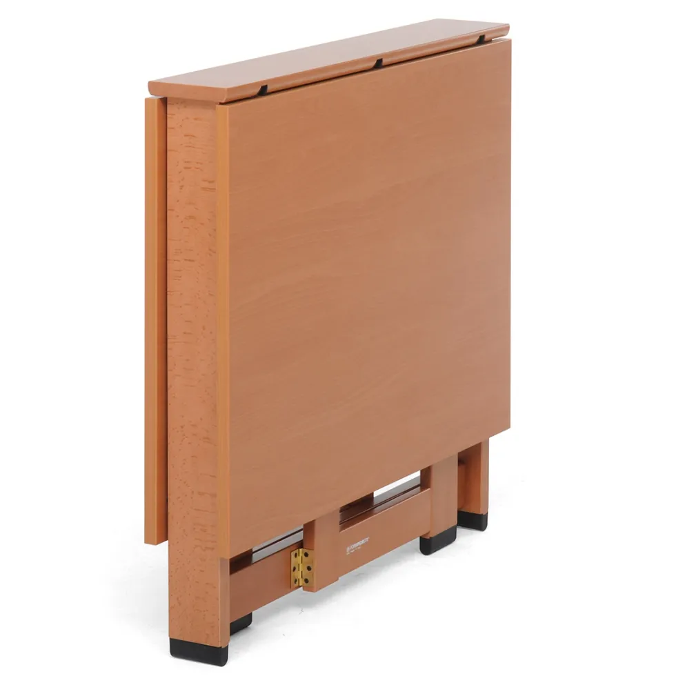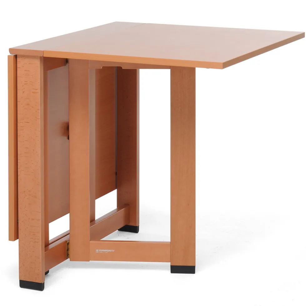 Il tavolo pieghevole Cartesio di Foppapedretti ha una solida struttura in legno massiccio di faggio verniciato noce, con robusti piani apribili secondo le esigenze e piedini in nylon.