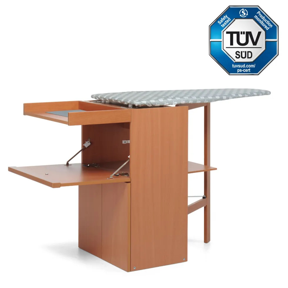 LoStiro, quando è chiuso, è un mobiletto elegante e raffinato e si sposta facilmente grazie a ruote antigraffio. La solida struttura del mobiletto è in truciolare nobilitato, il telaio di sostegno al piano da stiro è in legno massiccio di faggio verniciato, mentre il piano da stiro in pioppo ha fori traspiranti.